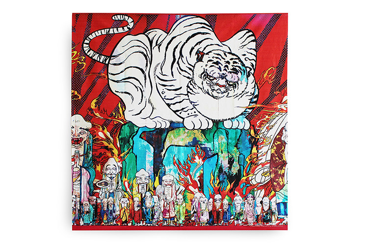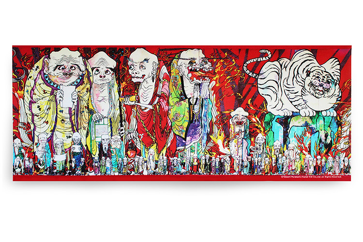 這次的「村上隆の五百羅漢図展」於日本知名的森美術館展出,其中最厲害的展就是全長高達100 公尺的超級大作「五百羅漢図」了!而這個作品是結合了全日本眾多知名美術大學超過200 位的學生一起合力完成。將中國古代傳說中掌管東、西、南、北四地的聖獸:「青龍」、「白虎」、「朱雀」、「玄武」分為四大部分來呈現這幅巨作,將宗教、藝術、死亡、現實等意象採用日式傳統繪師的風格完美呈現。