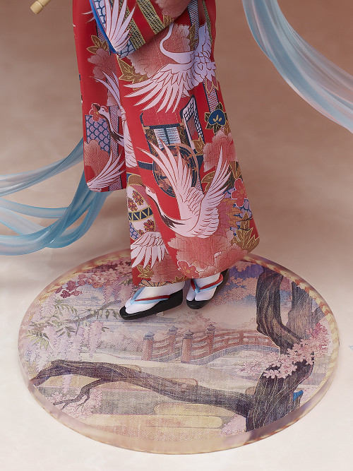 超人氣美少女初音未來(初音ミク)是電腦世代文化所產生的虛擬角色人物,以初音未來主題打造的「雪音未來的天空城」雪ミク スカイタウン(名稱暫譯),位於新千歳空港ミナルビル樓的專門店,這次由插畫家 藤ちょこ所繪製身穿花色衣的初音未來立體商品化,作品還包含有前方的花卉,其身穿有華麗圖案的和服也精彩再現,並且拿有顏色鮮豔的傘配件,圓形底座也有特殊圖樣印刷的壓克力材質,經典的雙馬尾使用透明材質來表現其不一樣髮色的層次等等。