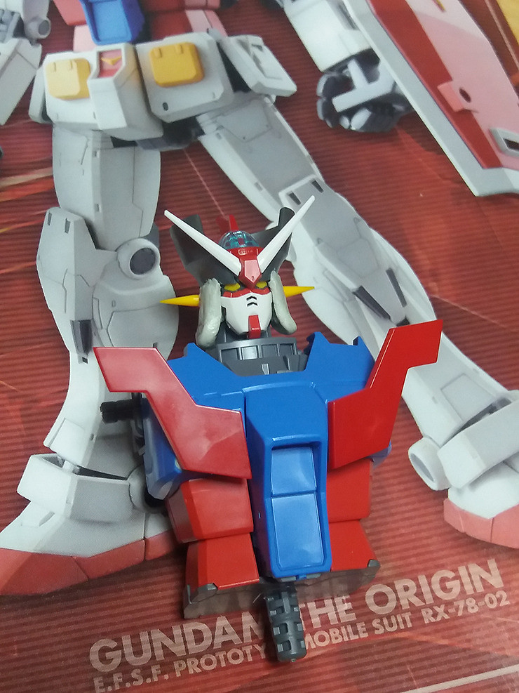 這一款作品,是使用去年底所發行的MG 1/100 RX-78-2(GUNDAM THE ORIGIN版) 為基礎,改造成了昭和時代最具代表性的熱血機器人「無敵鐵金剛」(大魔神、魔神金剛)。作者是韓國的鋼普拉模型高手“곰나으리”。其實他在2012年時就曾經使用RX-78-2 鋼彈模型,製作出這一款作品。熟悉了製作方式之後,這次再度以可動性表現更好的ORIGIN版再度挑戰。