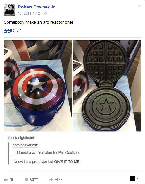 飾演「鋼鐵人」東尼‧史塔克的知名好萊塢男星小勞伯道尼(Robert Downey Jr.),在他的官方Facebook 帳號上,張貼了一款美國隊長盾牌造型的鬆餅機,引發了熱烈的話題。