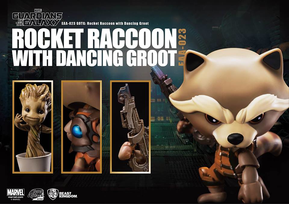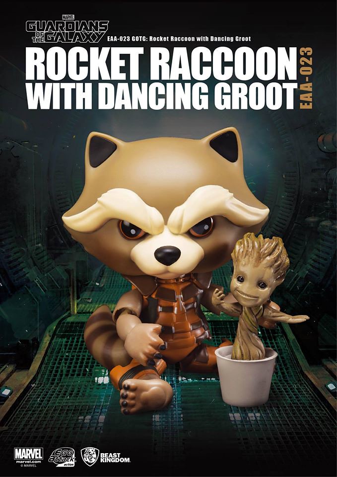由野獸國玩具公司所推出最新的Egg Attack Action 系列可動公仔作品,繼推出了電影復仇者聯盟:奧創紀元中的「美國隊長」與「雷神索爾」作品之後,又將推出另一款經典的MARVEL 系列的超級英雄作品,這次所要推出的最新作品是電影星際異攻隊(Guardians of the Galaxy)中很搶戲的「火箭浣熊與小樹人格魯特」(Rocket Raccoon with Dancing Groot)。