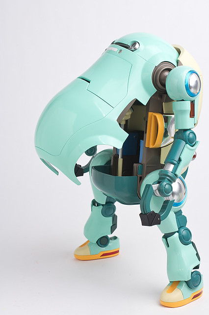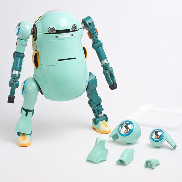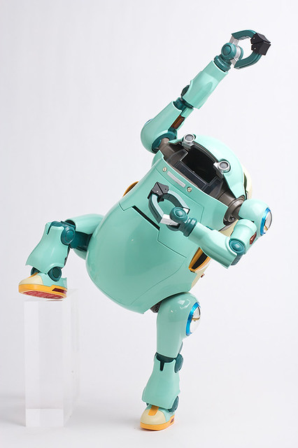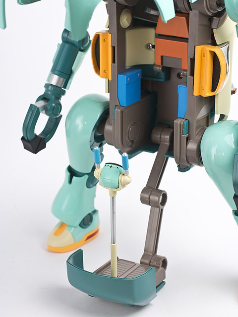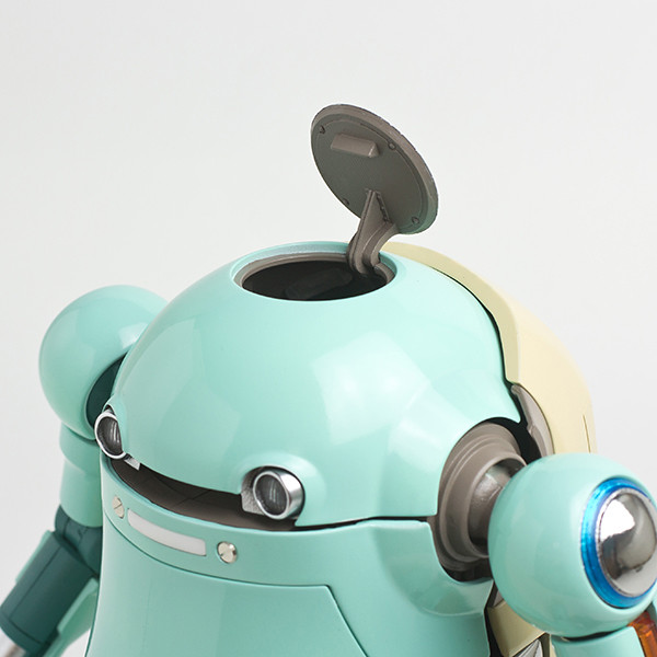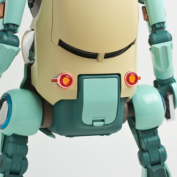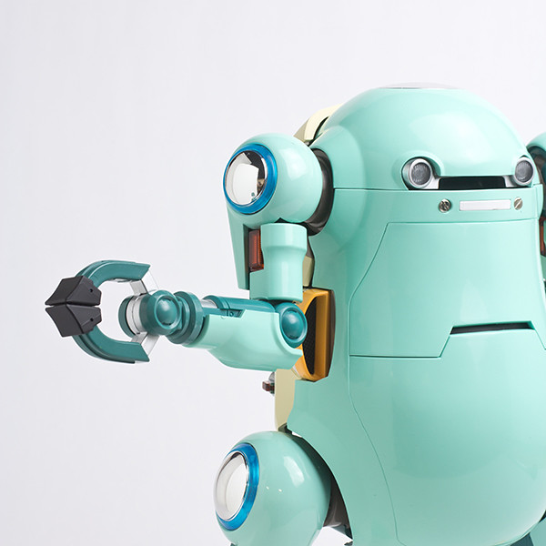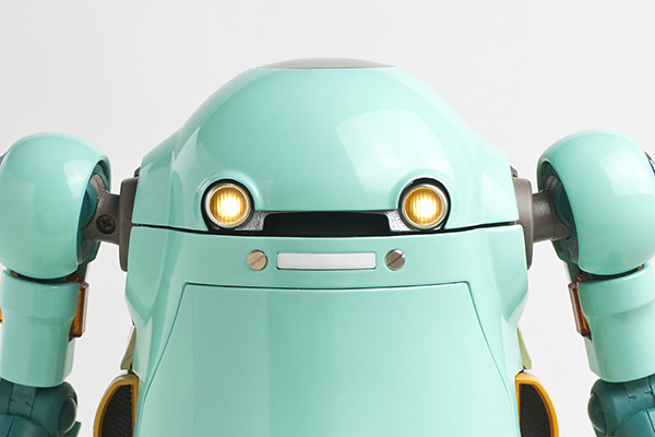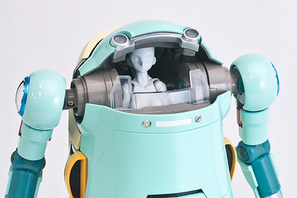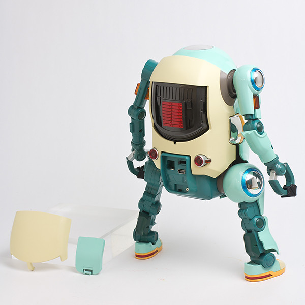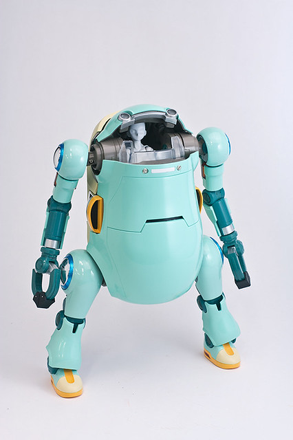 首波以小林和史老師喜歡的淺藍配色呈現,頭部及駕駛艙都可以開啟,並且有可以升降的操作駕駛的裝置,駕駛的位置大小適用其他家玩具廠商的1/12比例的可動人偶,手部及多處都配置有可動關節等等,在眼睛和背後的部位都配置有Led燈的發光裝置,設計有USB充電連結的插孔,手部和腳部等等部位的裝甲也可以自由拆卸,喜歡35機動機器人WeGo的玩具人可以參考一下歐!