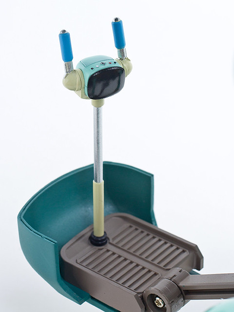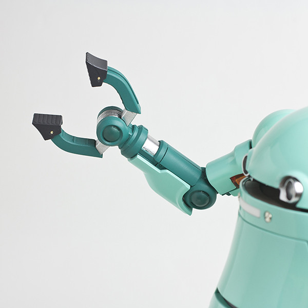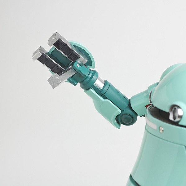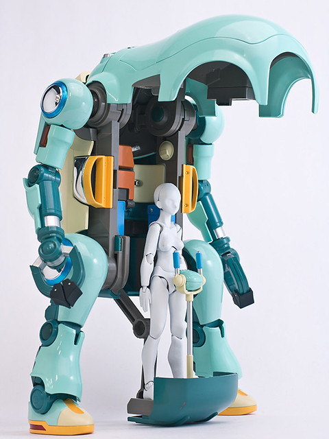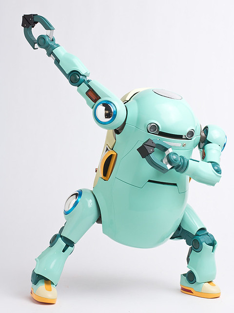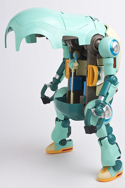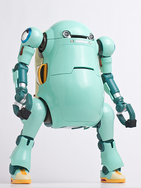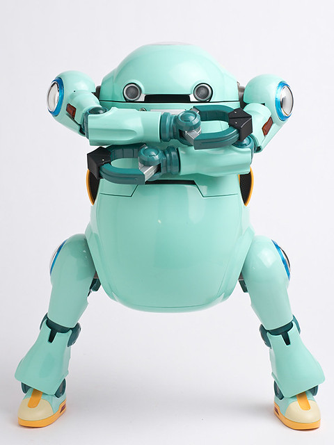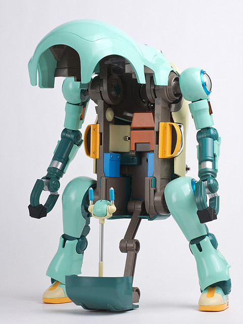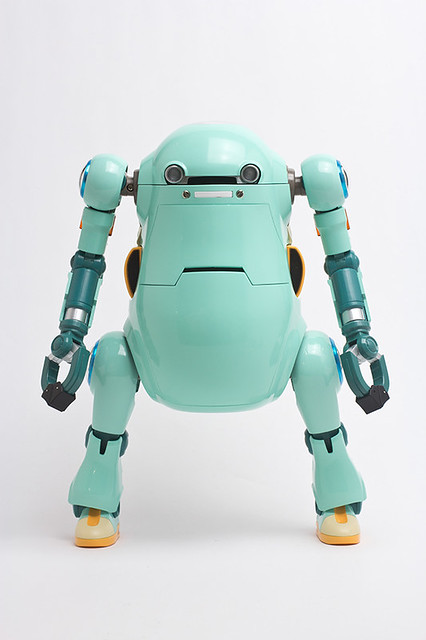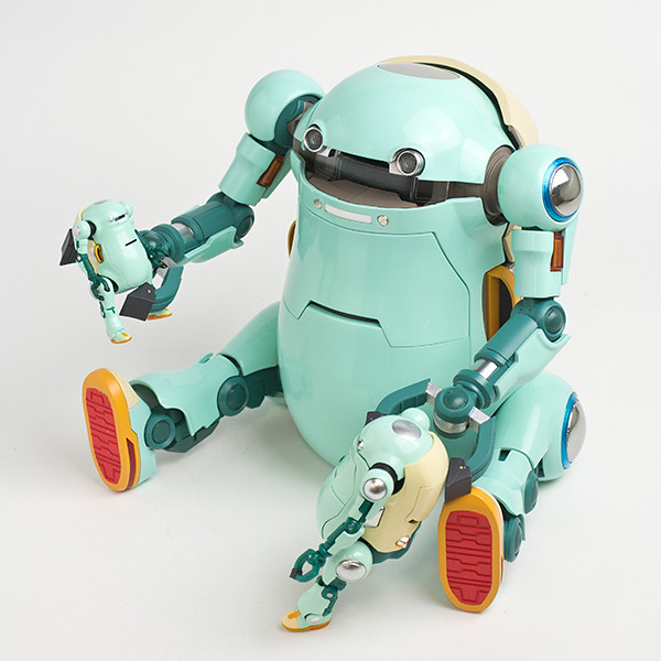 首波以小林和史老師喜歡的淺藍配色呈現,頭部及駕駛艙都可以開啟,並且有可以升降的操作駕駛的裝置,駕駛的位置大小適用其他家玩具廠商的1/12比例的可動人偶,手部及多處都配置有可動關節等等,在眼睛和背後的部位都配置有Led燈的發光裝置,設計有USB充電連結的插孔,手部和腳部等等部位的裝甲也可以自由拆卸,喜歡35機動機器人WeGo的玩具人可以參考一下歐!