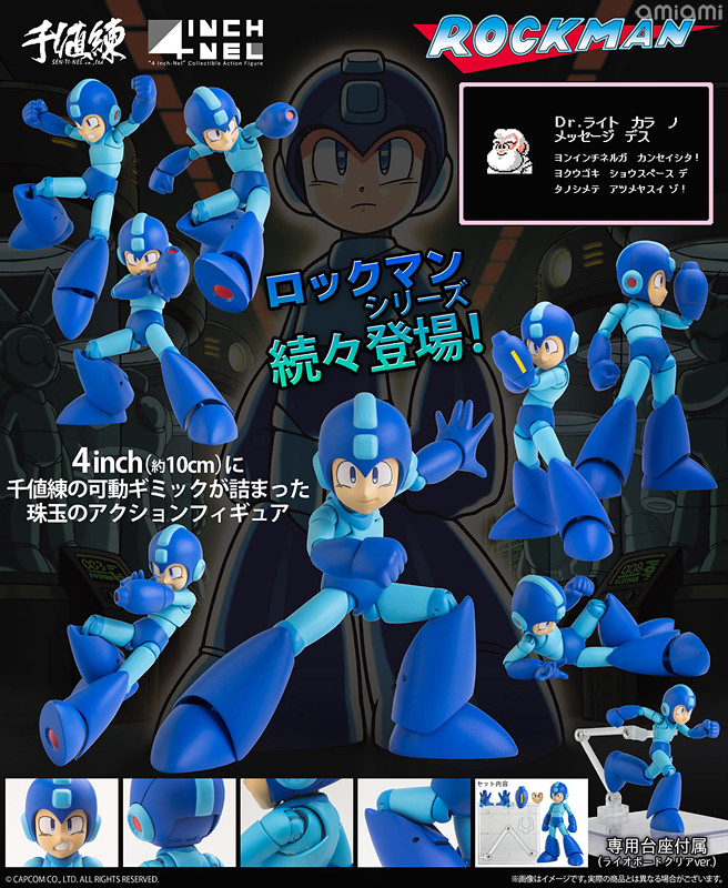 日本知名廠牌「千值練」2016年新推出的嶄新小尺寸可動玩具系列「4INCHNEL」,繼首款作品《蓋特機器人》主角“流龍馬”之後,宣布將推出知名動作電玩《洛克人》主角“洛克人”(ロックマン),以及《洛克人EXE》主角“洛克人EXE”。