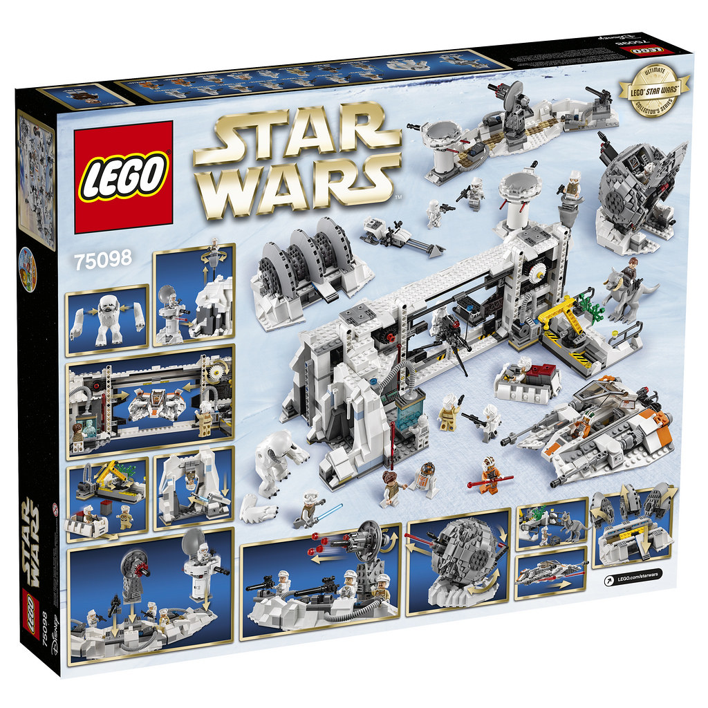 從目前所公佈的外盒正反面照片可以看見,這次的「霍斯戰役」盒組是以回音基地為主體,搭配著抵抗帝國軍的球型外觀的v-150 行星防禦離子炮(v-150 Planet Defender Ion Cannon)、DSS-02 防護盾產生器(DSS-02 Shield Generator)、DF.9 反步兵炮塔(DF.9 Anti-Infantry Battery)、雷達造型的1.4 FD P 塔(1.4 FD P-Tower)。此外,還有經典的雪怪洞穴(Wampa Cave)以及巨大的雪怪樂高迷你人偶,當然,韓索羅(Han Solo)騎著咚咚獸(Tauntaun)的經典場景也是不能少的啊!
