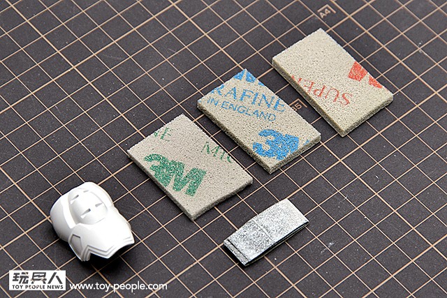 ▼ 接下來經過一天的乾燥時間後準備要開始打磨去除溢膠,研磨需要準備400號砂紙、研磨海綿紅、藍、綠。