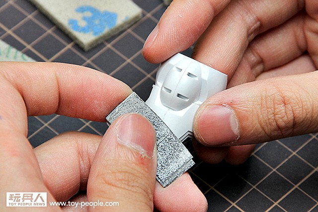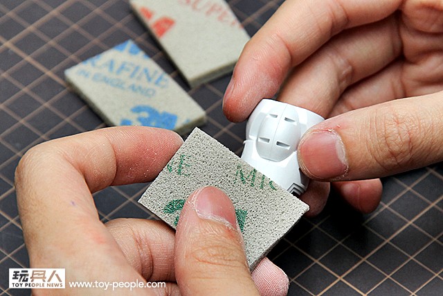 ▼ 將溢膠磨平後,繼續使用紅→藍→綠海綿砂紙將零件刮痕拋光。