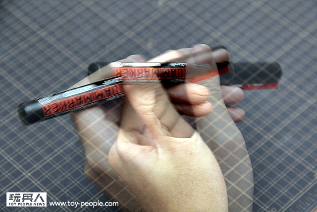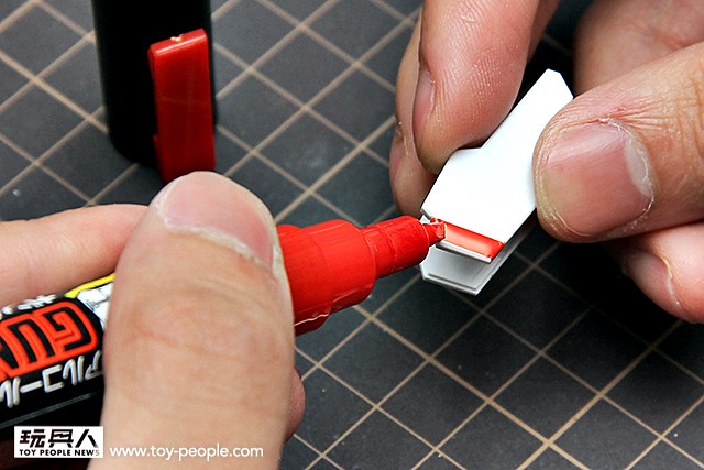 ▼ 一些形狀比較簡單的分色我們可以直接用鋼彈麥克筆作補色,使用前請先搖晃均勻,讓筆管中的顏料和稀釋液可以融合在一起,在這裡使用的是GM08 鋼彈紅。