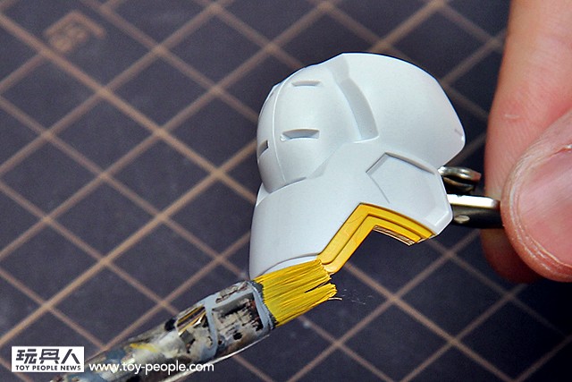 ▼ 在面對大面積時必須用平頭筆來讓顏色一次到位,順著零件邊緣的線條塗裝,之前先加深刻線的零件,顏料也比較不容易溢出範圍。
