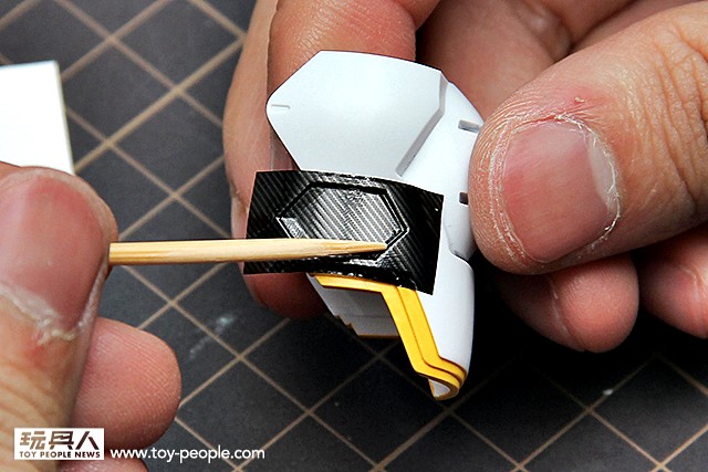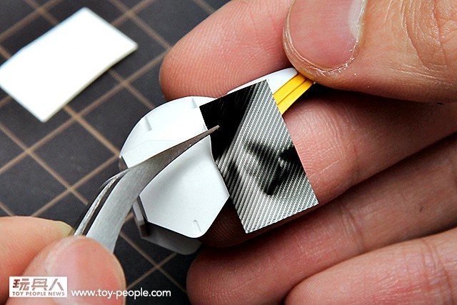 ▼ 切下一片碳纖維貼紙小心的服貼在零件上。