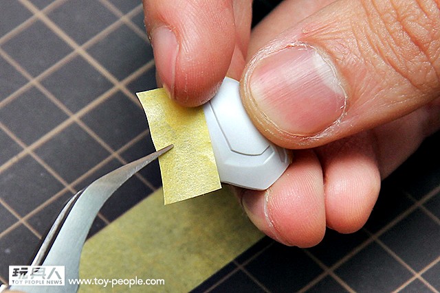 ▼ 首先用剪刀剪下遮蓋膠帶,將其貼在凹槽邊緣凹陷比較淺的部位。