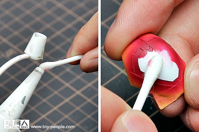 ▼ 由於內側的部分凹陷較深,所以採用擦拭法。用棉花棒沾一點T-01溶劑,把凹槽以外的顏料擦拭乾淨,留下凹槽中的顏料。
