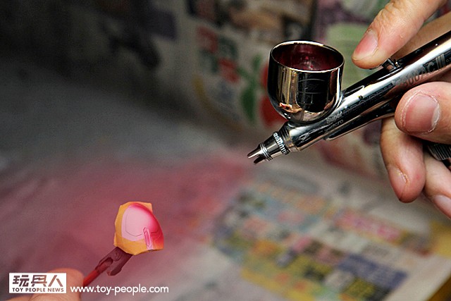 ▼ 用噴筆將調好的漆料均勻的把凹槽部位噴滿(調色的方法可以參考上一篇骨架製作教學)。