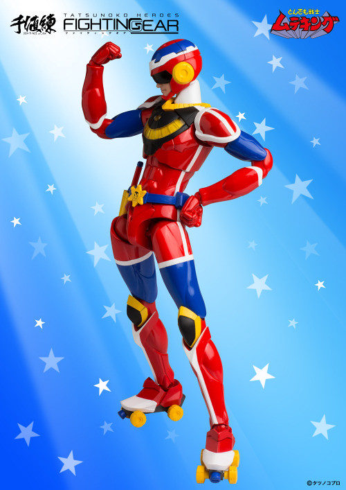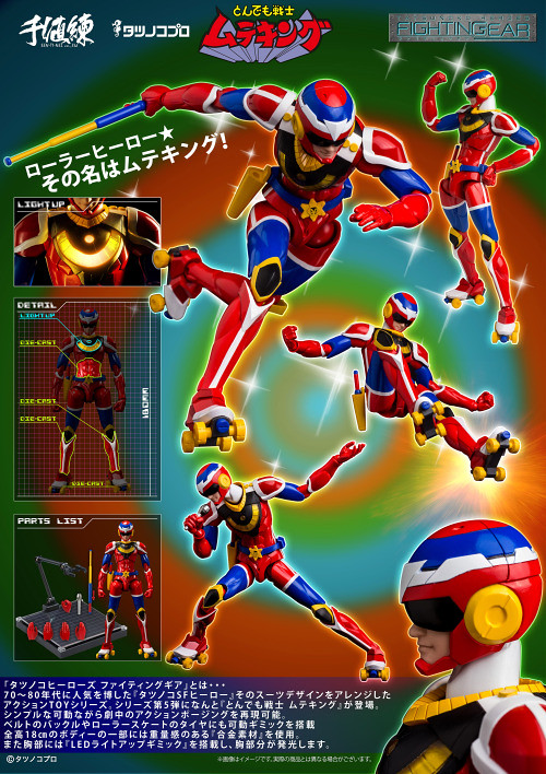 日本玩具廠商千值練以老牌動畫公司「龍之子」(タツノコ)系列動畫主角,立體化的可動玩具系列「龍之子英雄 戰鬥機器系列」タツノコヒーローズ ファイティングギア已經推出多款精彩作品,近日官網在公開《萬能戰士無比敵》とんでも戦士ムテキング(名稱暫譯),其系列高可動度的素體部分使用了合金製作,胸口並且搭配有LED發光的設計,能夠讓胸口的符號發光,雖然這部動畫在台灣不是很多人知道,但是外表腳上有「溜冰鞋」造型的特殊設定也相當吸睛啊!喜歡《龍之子英雄FIGHTING GEAR》系列的玩具人可以參考一下歐。