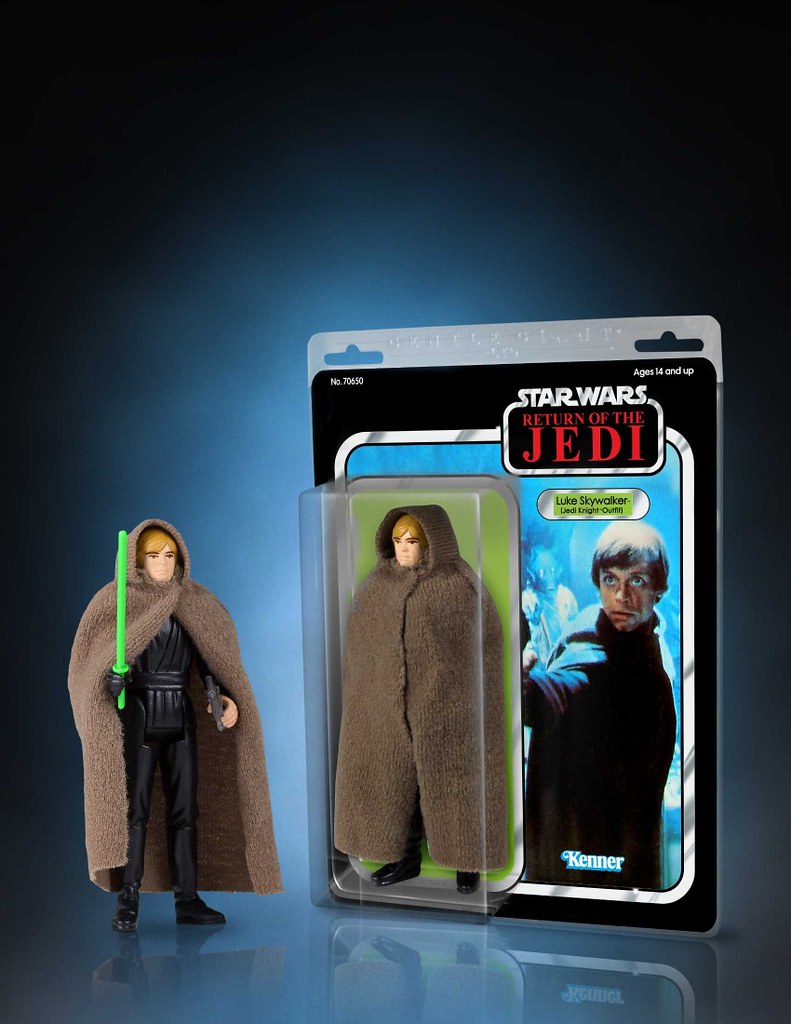這個Jumbo 大吊卡系列的作品主要是將之前所推出過Kenner Vintage 3.75 吋吊卡系列的人偶作品放大到12 吋的大小,這絕對是喜愛巨大化玩具人的首選啊!而這次所要的星際大戰系列「路克.天行者」作品,是在電影開始初登場時的造型。與過去3.75 吋的包裝以及配件相同,這次除了有附上布材質的斗篷之外,還有一把綠色的光劍,而在左右手的顏色也不同喔。而這個造型也是路克.天行者一個非常經典的裝束造型,喜愛星際大戰的玩具人可不要錯過囉。