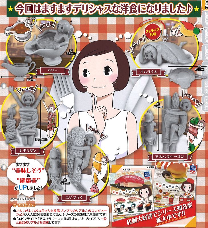 這系列由人氣漫畫家青木俊直(ToshinaoAoki)所設計的作品,主要是將可愛的大姊姊結合了可口的食物模型,讓這系列的轉蛋作品人氣大旺。而這次所要推出第三彈「妄想姊姊洋食屋」作品一共將推出五個款式,包含結合了咖哩(カリー)、蛋包飯(オムライス)、義大利麵(ナポリタン)、炸蝦(エビフライ)、培根蘆筍捲(アスパラベーコン)等等的食物造型結合,勢必又會掀起一股姊姊熱啊!