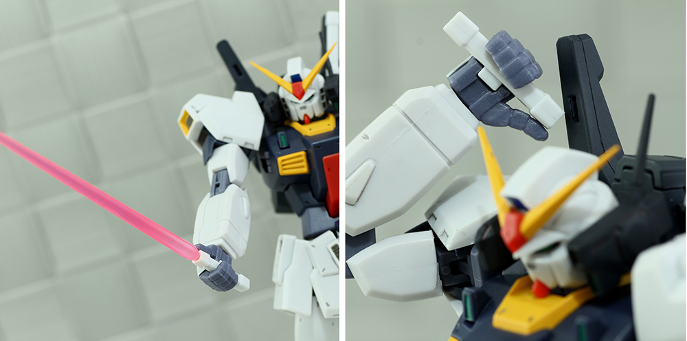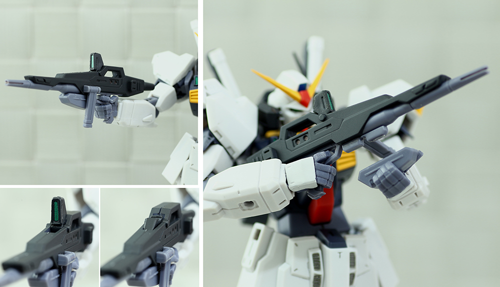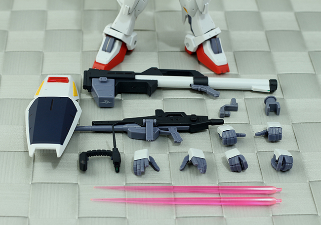 內物只有一層的厚度,應有的配件都有包括在內,如火箭炮、光束步槍等等,而值得一提的是有兩把光束劍提供,對比起前作Zeta只有一把的情況而論,B記算是厚道的了~但如果可以多幾個手型及彈夾就好了~