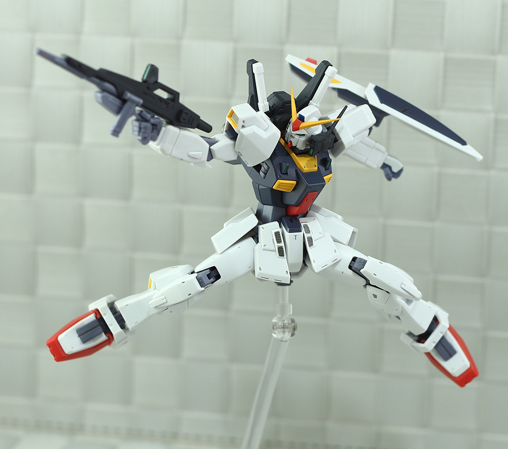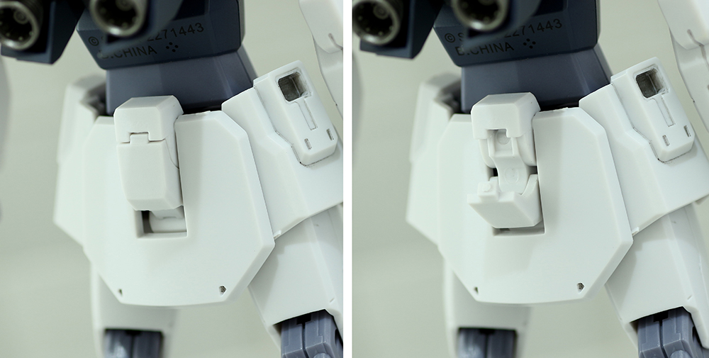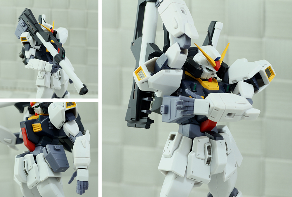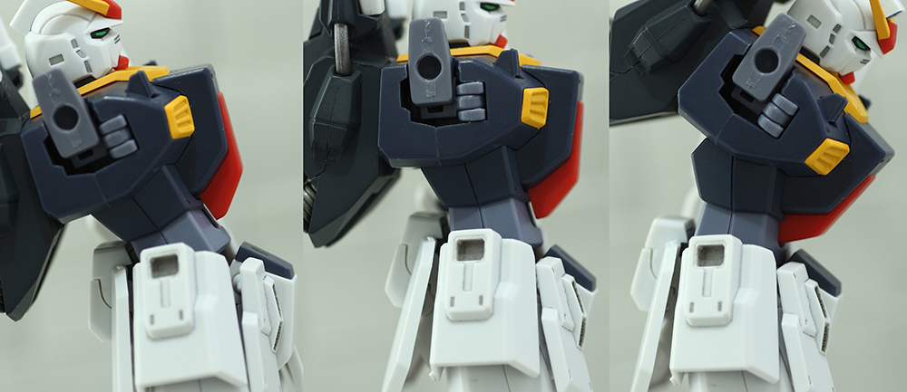 ▼肩關節的可動性令人感到驚訝,連難度最高的抱抱手也能夠做到。但可惜的是大腿的可動未如理想,雖然是有兩段可動的設計,但幅度太小....