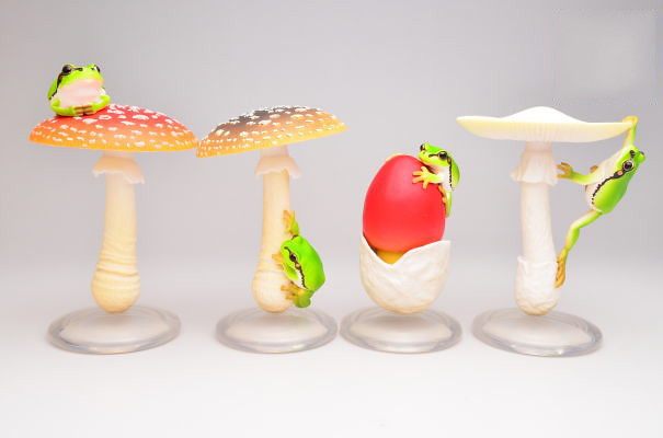 日本樹蛙(Buergeria japonica)又稱為日本溪樹蛙,體型比其他樹蛙還要小一些,是樹蛙科溪樹蛙屬的一個不會爬樹的樹蛙物種,這次也將其特性「不會爬樹」來改成爬蘑菇有趣的模樣來呈現,日本樹蛙的身體特徵背面有一些小顆粒突起,表面極其粗糙,牠們其中一個明顯的特徵是其背部的中央近肩胛的地方有一對短棒狀突起。