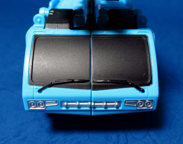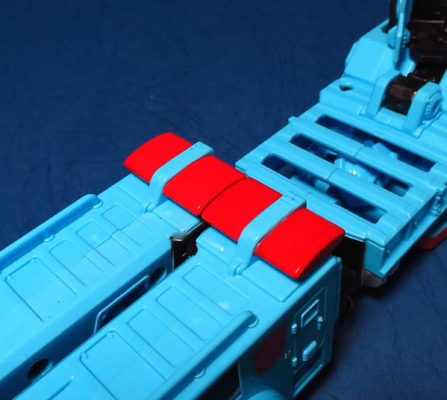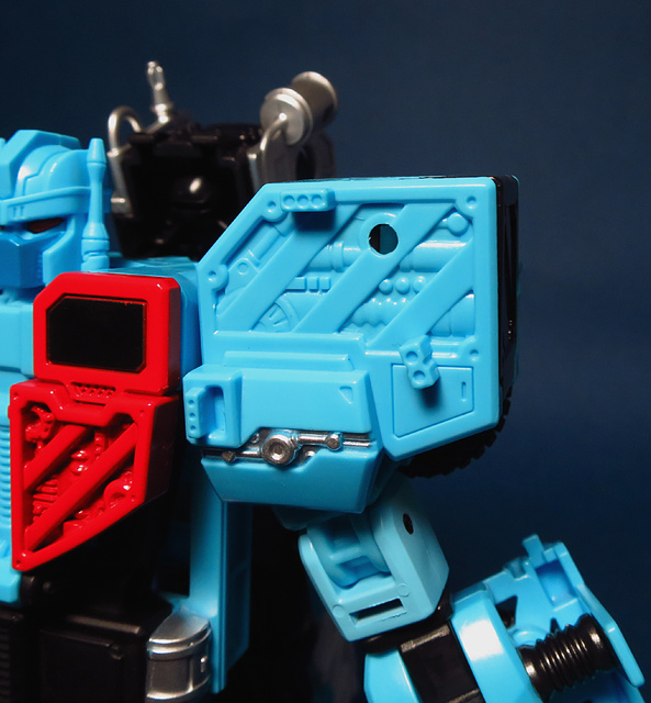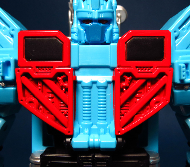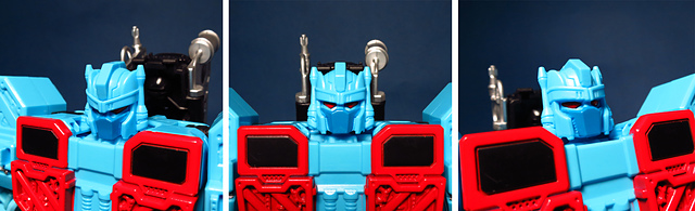 除了「硬體結構」層面的討論,另外我想提的,就是那充滿了爭議的塗裝與配色。UW產品線一如過往,繼承了日系一貫的傳統,賦予了熱點一身的動畫配色,這個秉持傳統的作法我們早前曾經提及,好或不好,見人見智,然而,這次我必須說,這回似乎不是那麼的...討喜。首先要提的,就是雙肩那標誌般存在的紅白線條,在G1老變中,這個部份是以貼紙表現,動畫中也許是為了作畫上的方便而被省略,然則,在本次的模組中,則是改用實體的刻線來作更寫實的呈現,美版也以紅銀色的漆料作塗裝,再配合上胸甲的點綴,讓整體的層次感更加豐富,可惜的是,UW便真的完全依照動畫的色塊配置,而完全保留肩部及胸甲的原色,看過美版後,總是讓人有一種...這裡好像少了些什麼的遺憾,也許哪一天,我還是會拿起噴漆重新幫他上個色吧。第二個想提出的則是頭部,若對元祖的老變還有印象,你應該會記得熱點其實有顆黑頭,這回美、日兩種版本則是都採用水藍色的動畫式配色,雖然這也是個人喜好的問題,但是總不免讓人有些許的惆悵,這顆頭顱,恐怕也會被我列入重新噴塗的名單中。