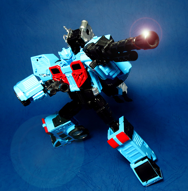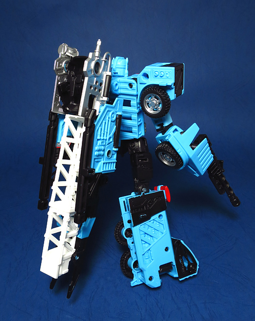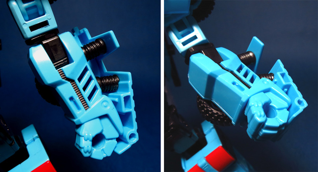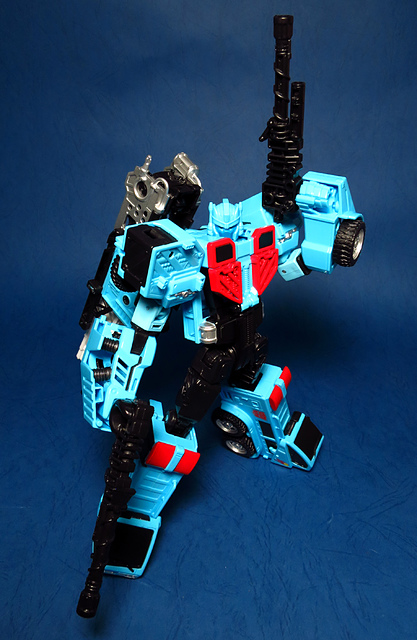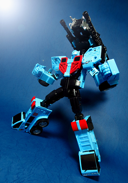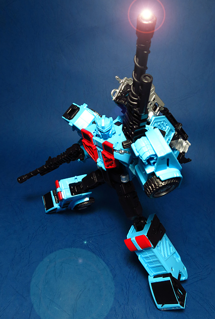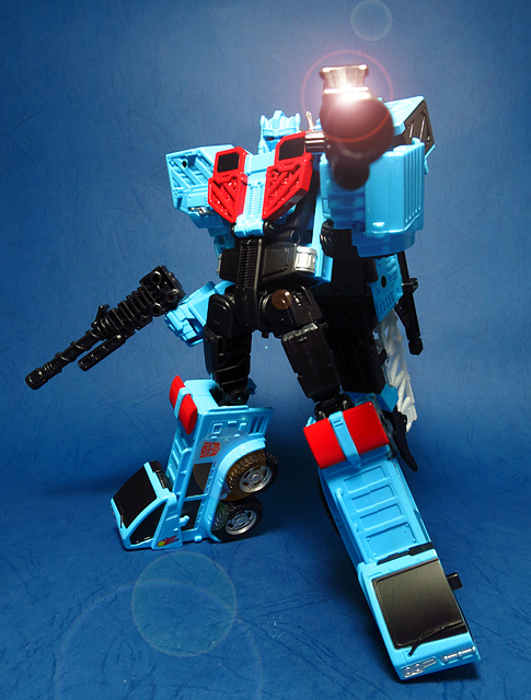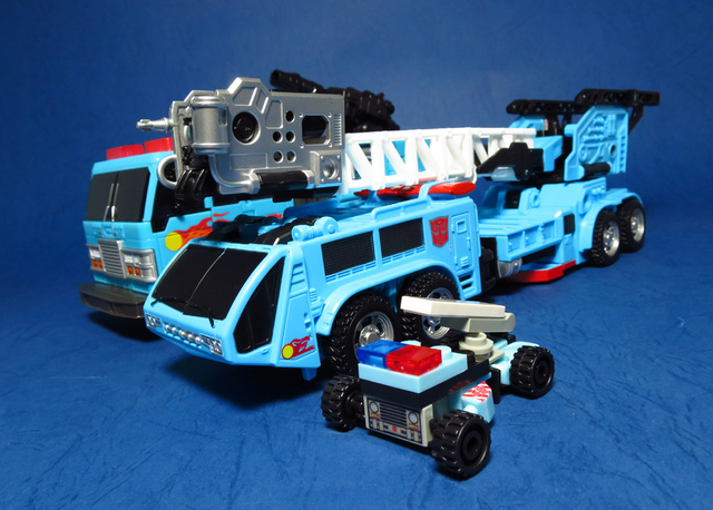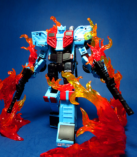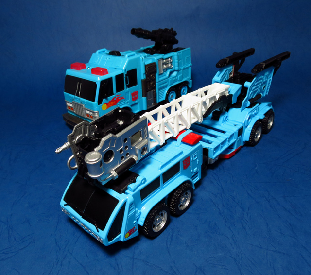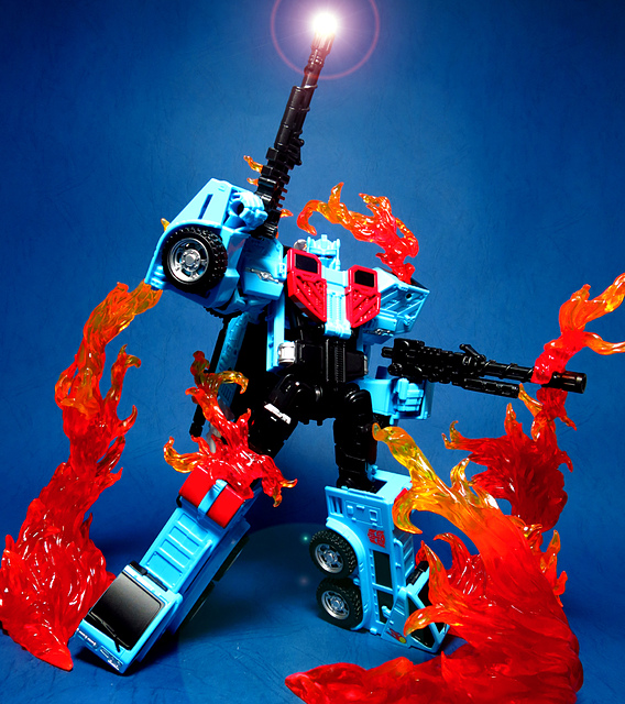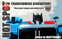 若要在合體戰爭的三個基礎本體中(註),挑選一個表現最佳、各種狀態下最為平衡的模組,本篇的熱點,我想將會毫無疑問地獲得第一高票。首先,在載具模式下,Silverbolt(銀箭/銀閃電/灰甲)的手臂收納就足以讓他直接出局,而Motormaster(汽車大師/馬達大師/車主)雖然在卡車頭模式下擁有高密度的收納狀態,然則,就是少了一個特徵般存在的貨櫃,此外,在車頭模式下他幾乎沒有任何的可動機關,甚至武器的收存也差強人意,反觀熱點,不僅擁有收納良好的車型,還有著一整副可玩性極高的雲梯,而武器的收納雖然外顯了些,卻不會過份地突兀,在載具模式這項目,熱點絕對是穩拿一分。再來讓我們來看看機器人模式,銀箭在這方面有著優於飛機型態的表現,但是在一些關節的表現還是稍嫌差了些,而汽車大師雖然有著優良的可動,卻敗在不甚討喜的身形比例,熱點呢,則是同時坐擁了優良的體態與高度的可動性,光是那個能夠低頭的頸關節,就讓整體帥氣度上升不少,更別說在站姿上還能達成S形,可謂三者中表現最突出的一個,葛來芬多...啊不對,是熱點、再得一分!最後,則是第三型態-合體模式,這部份我認為三者各有長處:構成Superion(速伯利昂/大無畏/超級戰士)本體的銀箭擁有極佳的關節強度,唯一可惜的就是那雙由單體雙臂變化而來的大腿實在是過於瘦弱,不免在比例上略顯可惜,至於作為Menasor(威脅者/飛天虎/萬能喪士)本體的汽車大師雖然在變形機構上提供了許多模糊地帶,以致於玩家們能夠自己研發出更帥氣的非官方式變法(好吧...這其實應該算是缺點吧XD),但是在髖關節的強度上,依舊是個十分為人詬病的遺憾,而本篇的主角熱點,則是有著紮實的外表與硬漢般的身形,可惜的是,他的頸部關節不夠靈活,無法低頭讓他在「碩大感的營造」上大打折扣,另外,髖關節的設計也略顯鬆軟,腿部也容易在旋轉時爆開,若能將這些缺點加以改進,我還是很樂意,將第一名的票投給熱點(畢竟...是本篇的主角嘛XD)。