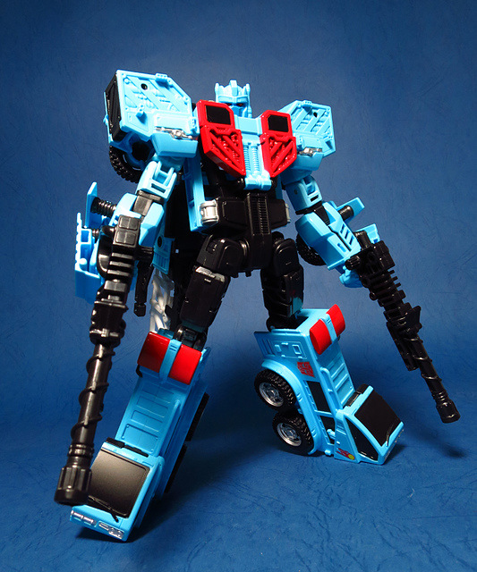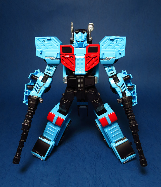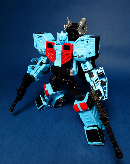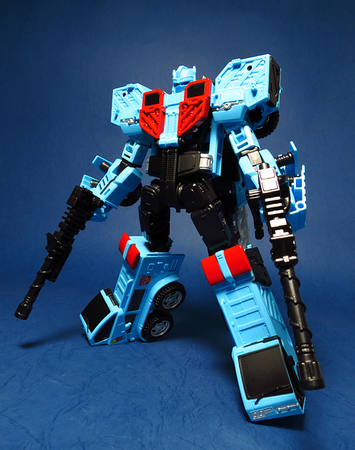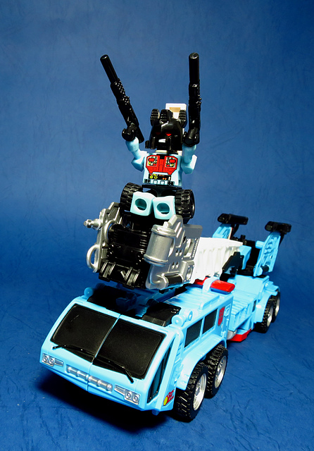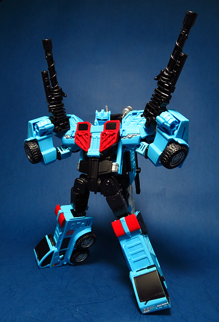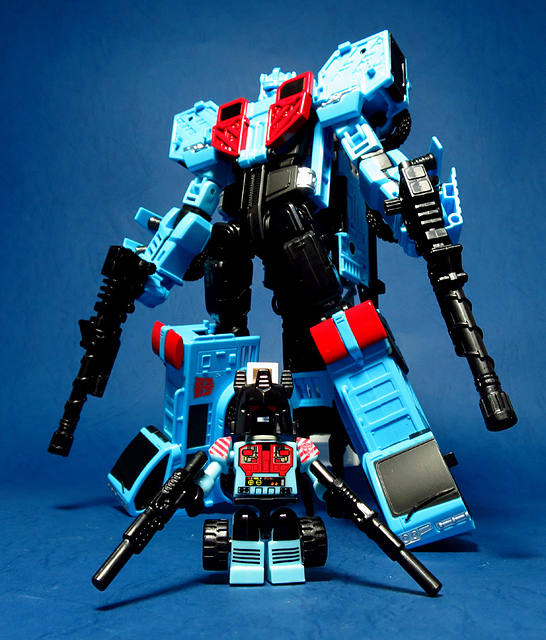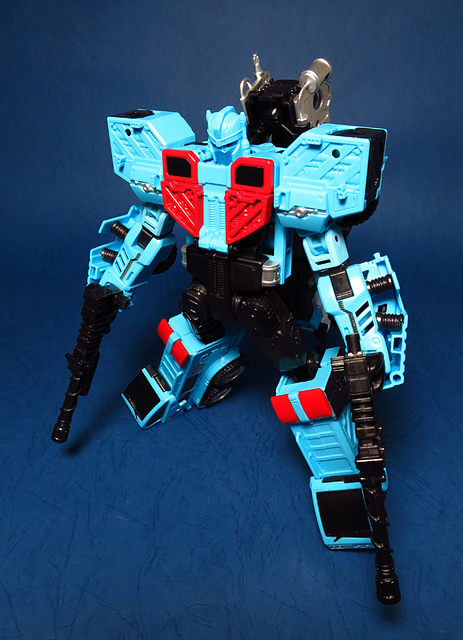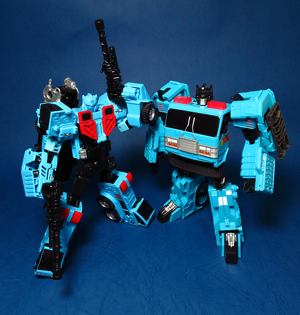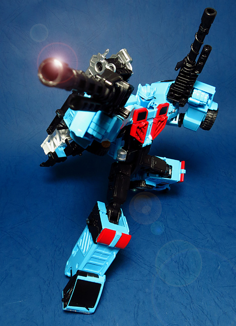 若要在合體戰爭的三個基礎本體中(註),挑選一個表現最佳、各種狀態下最為平衡的模組,本篇的熱點,我想將會毫無疑問地獲得第一高票。首先,在載具模式下,Silverbolt(銀箭/銀閃電/灰甲)的手臂收納就足以讓他直接出局,而Motormaster(汽車大師/馬達大師/車主)雖然在卡車頭模式下擁有高密度的收納狀態,然則,就是少了一個特徵般存在的貨櫃,此外,在車頭模式下他幾乎沒有任何的可動機關,甚至武器的收存也差強人意,反觀熱點,不僅擁有收納良好的車型,還有著一整副可玩性極高的雲梯,而武器的收納雖然外顯了些,卻不會過份地突兀,在載具模式這項目,熱點絕對是穩拿一分。再來讓我們來看看機器人模式,銀箭在這方面有著優於飛機型態的表現,但是在一些關節的表現還是稍嫌差了些,而汽車大師雖然有著優良的可動,卻敗在不甚討喜的身形比例,熱點呢,則是同時坐擁了優良的體態與高度的可動性,光是那個能夠低頭的頸關節,就讓整體帥氣度上升不少,更別說在站姿上還能達成S形,可謂三者中表現最突出的一個,葛來芬多...啊不對,是熱點、再得一分!最後,則是第三型態-合體模式,這部份我認為三者各有長處:構成Superion(速伯利昂/大無畏/超級戰士)本體的銀箭擁有極佳的關節強度,唯一可惜的就是那雙由單體雙臂變化而來的大腿實在是過於瘦弱,不免在比例上略顯可惜,至於作為Menasor(威脅者/飛天虎/萬能喪士)本體的汽車大師雖然在變形機構上提供了許多模糊地帶,以致於玩家們能夠自己研發出更帥氣的非官方式變法(好吧...這其實應該算是缺點吧XD),但是在髖關節的強度上,依舊是個十分為人詬病的遺憾,而本篇的主角熱點,則是有著紮實的外表與硬漢般的身形,可惜的是,他的頸部關節不夠靈活,無法低頭讓他在「碩大感的營造」上大打折扣,另外,髖關節的設計也略顯鬆軟,腿部也容易在旋轉時爆開,若能將這些缺點加以改進,我還是很樂意,將第一名的票投給熱點(畢竟...是本篇的主角嘛XD)。