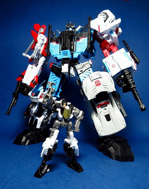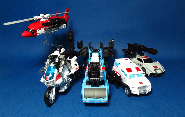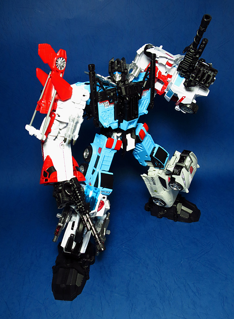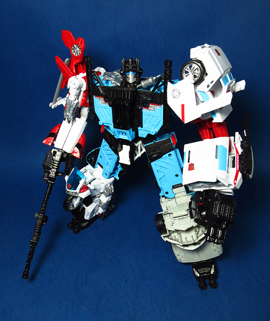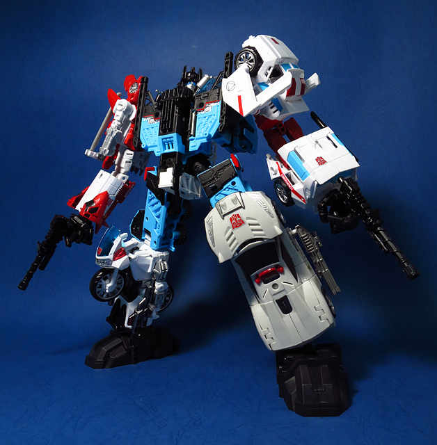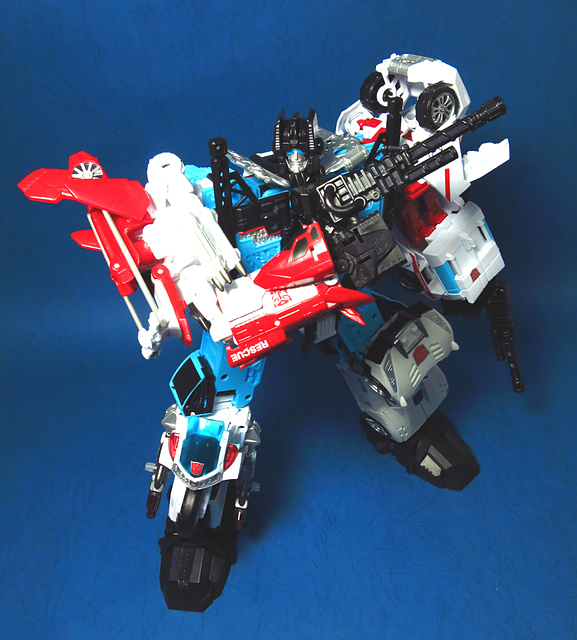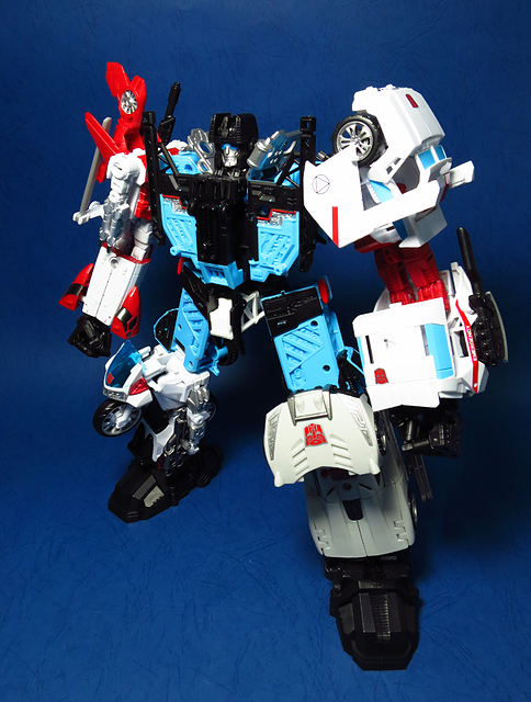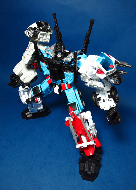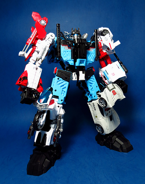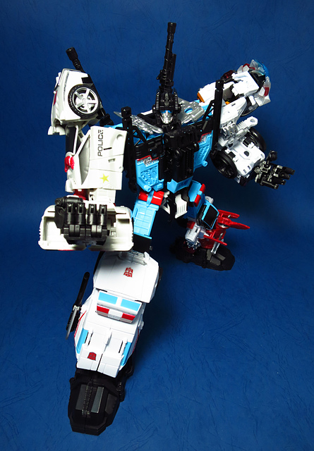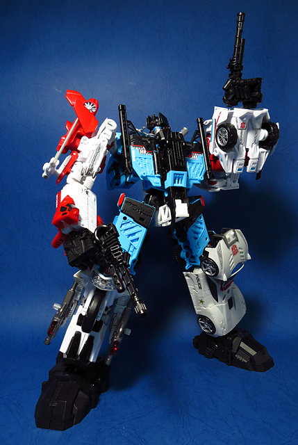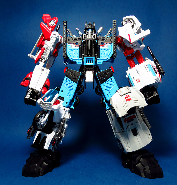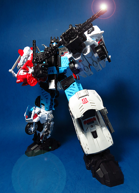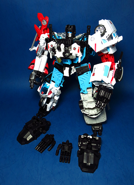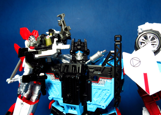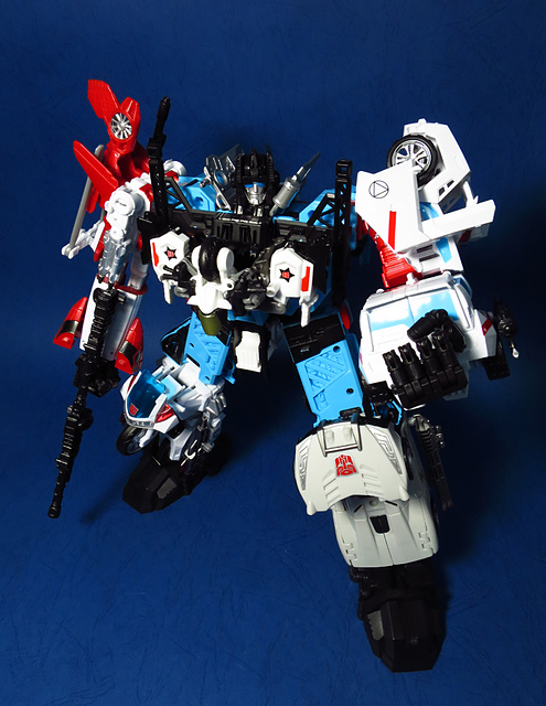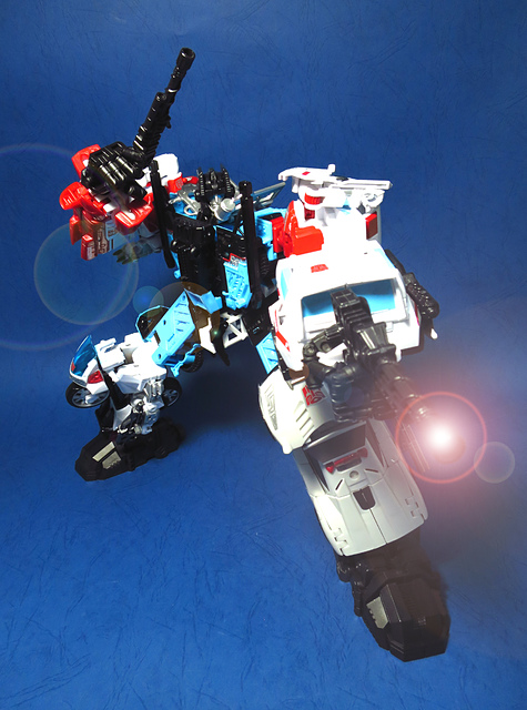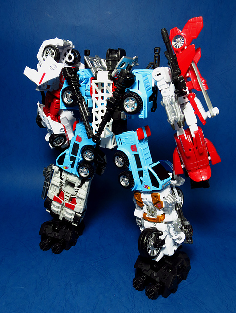 提到G1的合體金剛,當然少不了這支以「救援」為目的而生的小隊,在官方新造的合體戰爭系列中,自然也少不了這位守護巨人。然而,因應商業策略而安插進的新成員Rook(城堡/魯克),卻成了我對美版卻步的最大因素,即便這台裝甲車有著精綻的表現和良好的口碑,我始終無法對他產生任何情感,幸好,日版決定大刀闊斧開發新模,總算是完整地重現了傳統成員的組合,這才讓我心甘情願地收下這支救援部隊。以大合體的表現而言,我必須站在中立的角度告訴各位:守護神勝、在熱點,敗、也在熱點。首先,由熱點構成的本體確實將古早那種硬派的方正風格漂亮地重現,不論是頭部、胸部,都充滿了古典風格的懷舊風情,然而,髖關節的設計與官方的扁平腳板,卻也造就了他鬆散和短腿的後遺症,幸運的是,第三方廠商PERFECT EFFECT的強化零件非常神準地補強了身形比例這個問題,對官方的合體戰爭來說,PC系列絕對稱得上是最佳的救援者,在這裡依舊與同好們大力推薦!