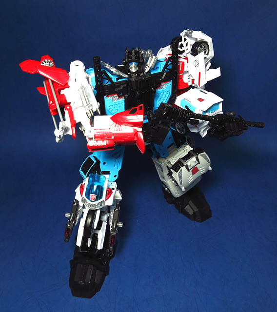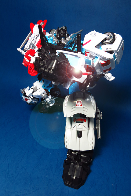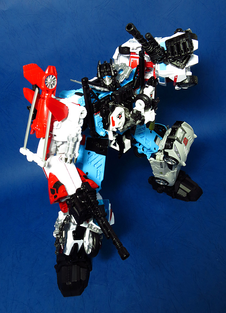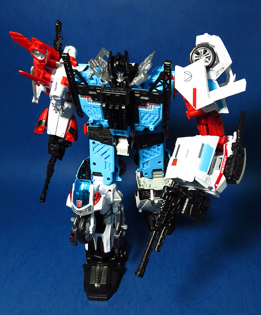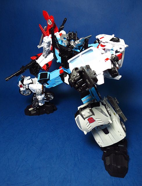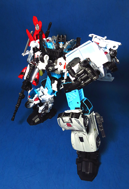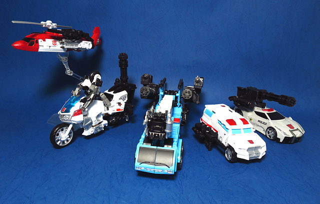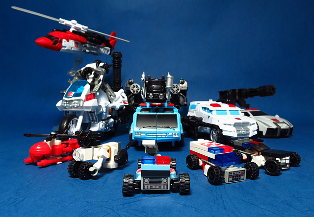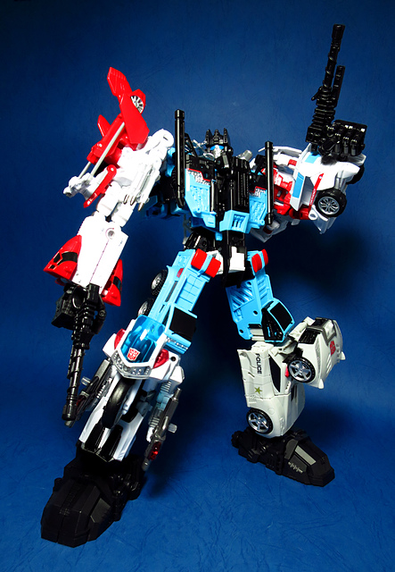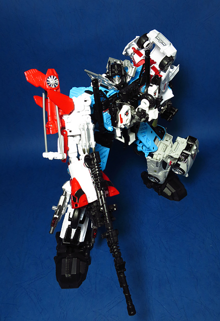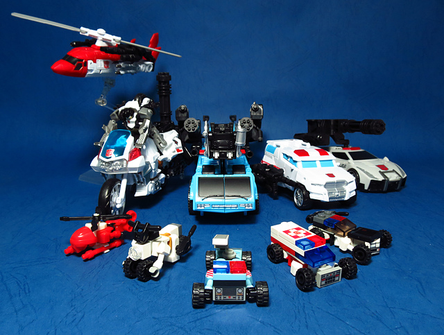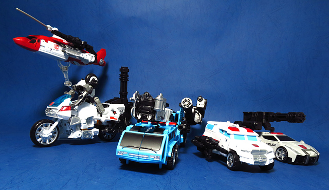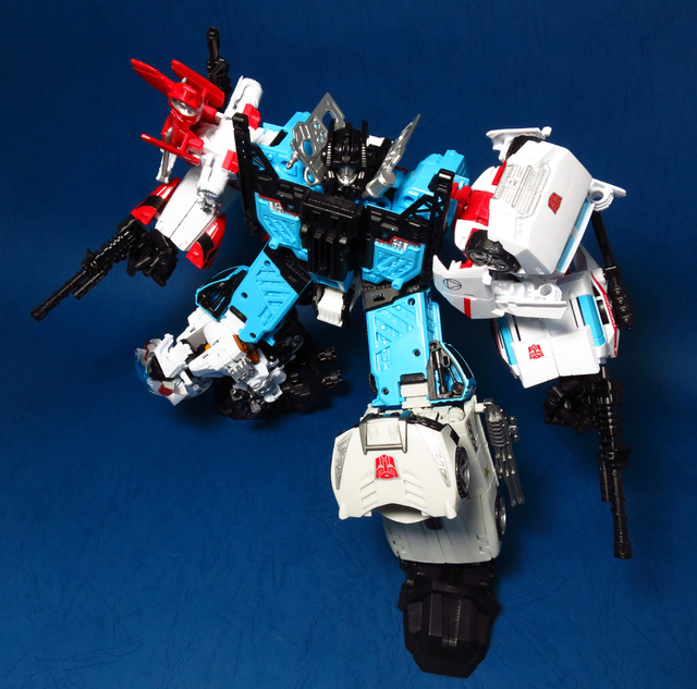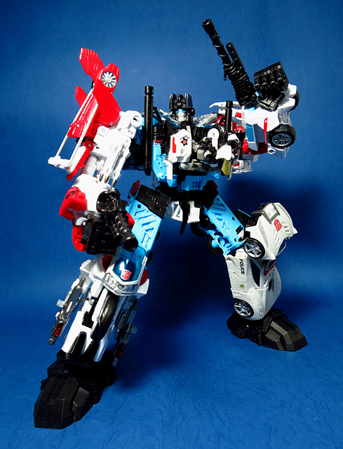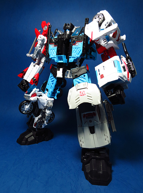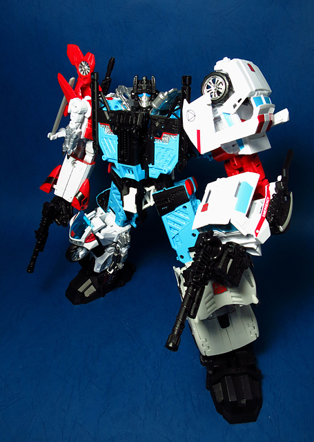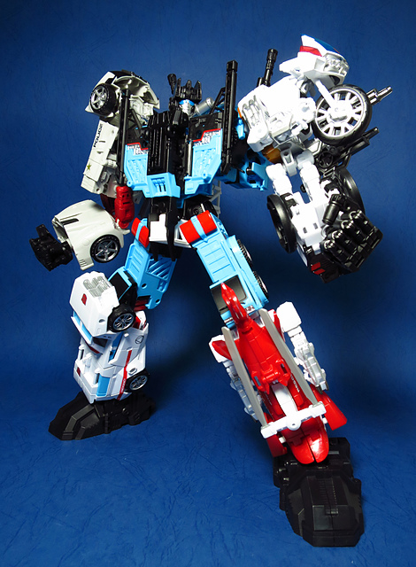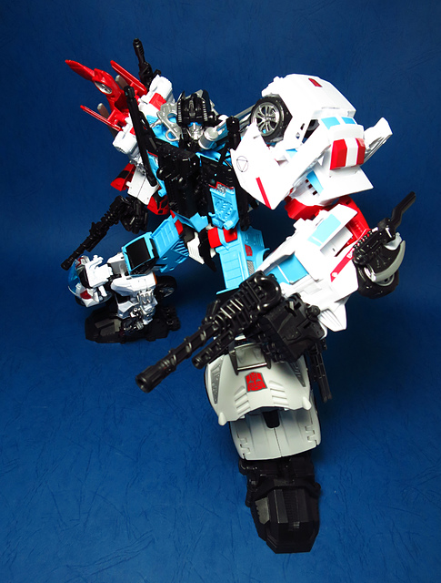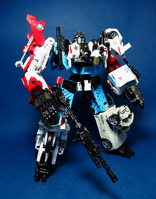 提到G1的合體金剛,當然少不了這支以「救援」為目的而生的小隊,在官方新造的合體戰爭系列中,自然也少不了這位守護巨人。然而,因應商業策略而安插進的新成員Rook(城堡/魯克),卻成了我對美版卻步的最大因素,即便這台裝甲車有著精綻的表現和良好的口碑,我始終無法對他產生任何情感,幸好,日版決定大刀闊斧開發新模,總算是完整地重現了傳統成員的組合,這才讓我心甘情願地收下這支救援部隊。以大合體的表現而言,我必須站在中立的角度告訴各位:守護神勝、在熱點,敗、也在熱點。首先,由熱點構成的本體確實將古早那種硬派的方正風格漂亮地重現,不論是頭部、胸部,都充滿了古典風格的懷舊風情,然而,髖關節的設計與官方的扁平腳板,卻也造就了他鬆散和短腿的後遺症,幸運的是,第三方廠商PERFECT EFFECT的強化零件非常神準地補強了身形比例這個問題,對官方的合體戰爭來說,PC系列絕對稱得上是最佳的救援者,在這裡依舊與同好們大力推薦!