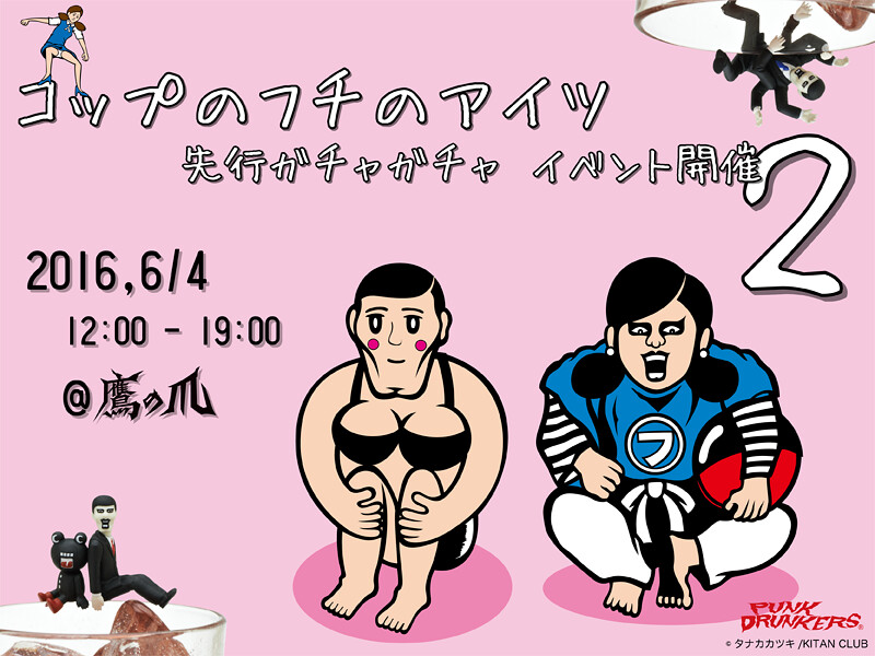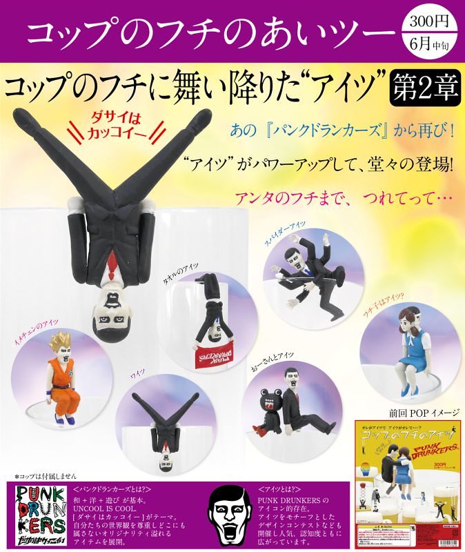 許多玩具人眾所注目的「杯緣子 × PUNK DRUNKERS」聯名合作第二彈的作品即將於明天2016年06 月04 日中午12:00 於東京千駄ヶ谷的店舖「鷹の爪HEAD SHOP」火熱熱登場!與之前第一彈的作品相同,這次同樣會推出六款加上一款隱藏版的款式:浴巾的那傢伙(タオルのアイツ)、改變形象的那傢伙(イメチェンのアイツ)、○ 公司的那傢伙(おーさんとアイツ)、蜘蛛人的那傢伙(スパイダーアイツ)、劈腿的那傢伙(ワイツ)、那傢伙是杯緣子?(フチ子はアイツ?)、以及隱藏的那傢伙與那傢伙(おーさんとアイツ) 。