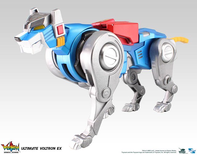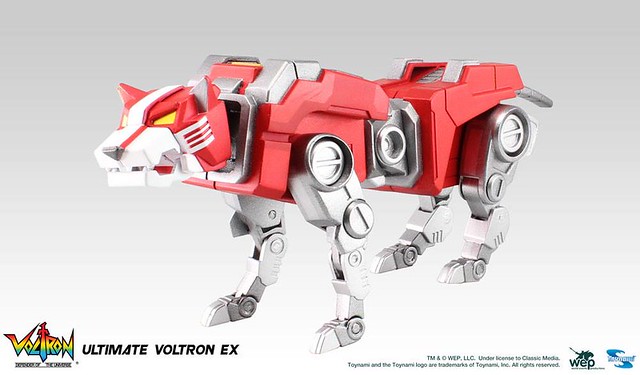 美TOYNAMI玩具公司之前已經推出過Q版本的“五獅合體《聖戰士 Voltron》”,這次將以高約16吋(約為40公分左右)的大尺寸來推出其「EX」旗艦版本,由公開的宣傳照片看起來再現動畫當中,五隻獅子的野獸型態可以合體組合變成一個主體機械人的模樣,合體之後也有十分靈活的可動性,現在都會擺出「膝蓋跪地」的動作來表現關節的高可動度。