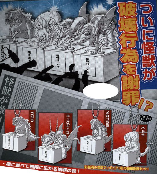這一款充滿幽默的惡搞轉蛋,讓怪獸之王哥吉拉與一群東寶電影的經典怪獸舉行謝罪記者會!~ 怪獸們個個露出了充滿悔意(或許沒有)、低著頭不語的懺悔姿態,為了他們侵略地球、破壞都市的行為舉行了公開記者會的模樣。除了怪獸之外,還將附有一張謝罪時接受採訪的桌子、道歉字條、麥克風,展現出與平常兇狠、大肆破壞的恐怖模樣截然不同的氣氛~