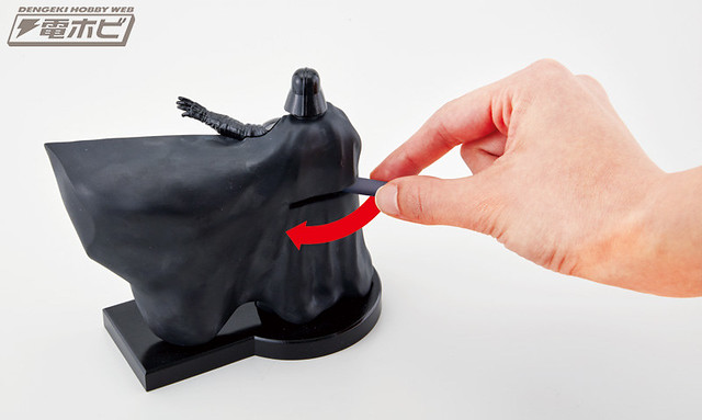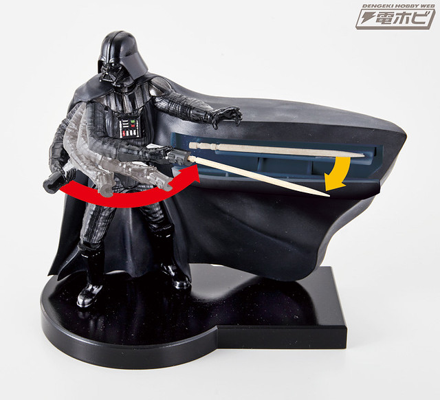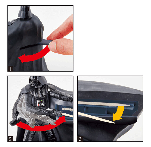「黑武士牙籤光劍收納盒」使用了《星際大戰》經典反派「黑武士」達斯‧維德的光劍姿態作為設計,將牙籤隱藏在隨著動作而飄起的披風之中,只要扳動背後的手把,黑武士就會自動將牙籤光劍取出並指向您! 明明是肅殺十足的光劍姿態,卻轉化為獻上牙籤的姿勢~ 創意十足的設計,就算沒有使用牙籤習慣的星戰迷也一定想擁有!