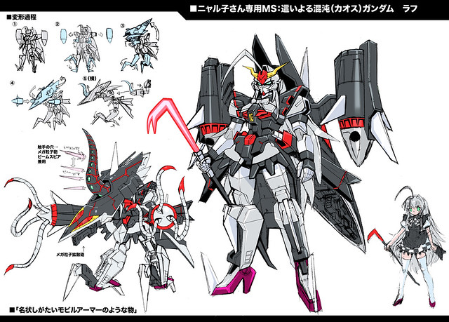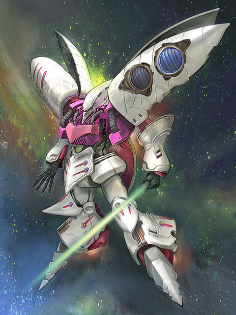 ▼ 鳯所駕駛的強化人專用精神感應鋼彈,40公尺高,搭載了多門MEGA粒子砲、I力場產生器、米諾夫斯基飛航系統、精神感應控制系統等等。並可變形成堅不可摧的飛行機動堡壘。