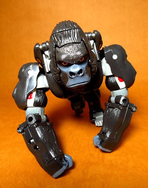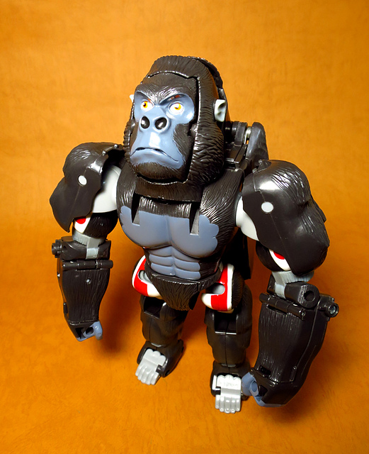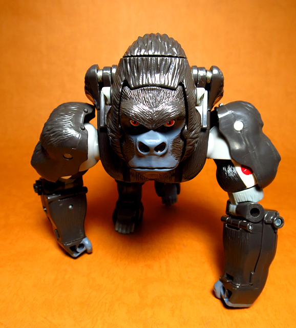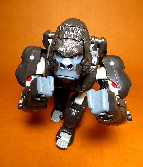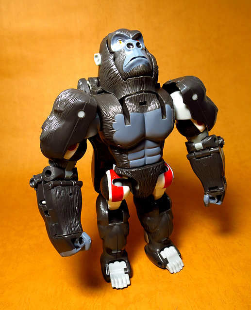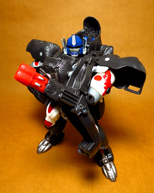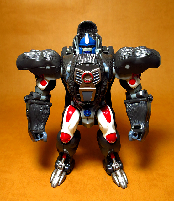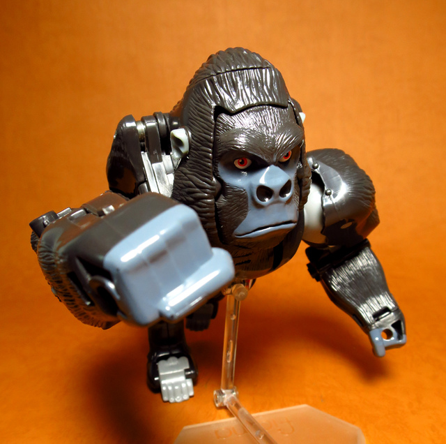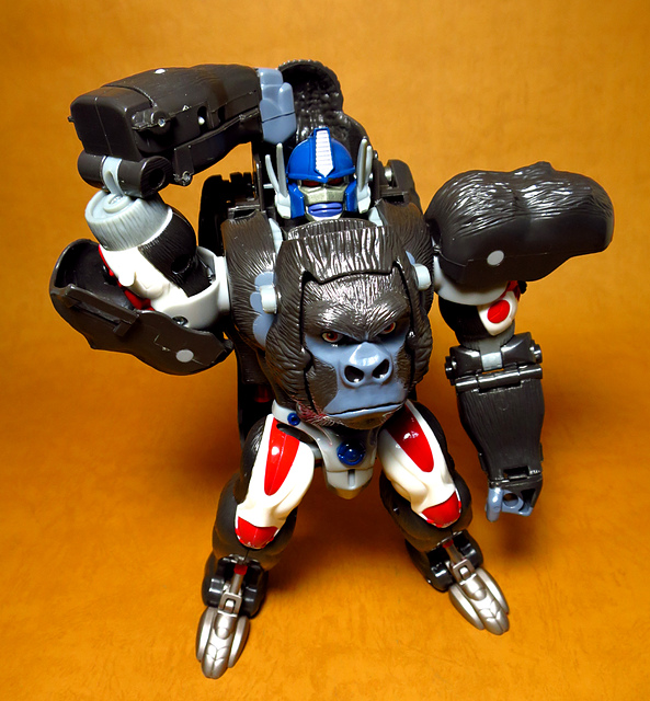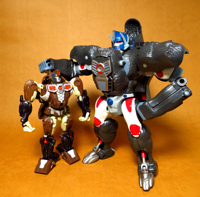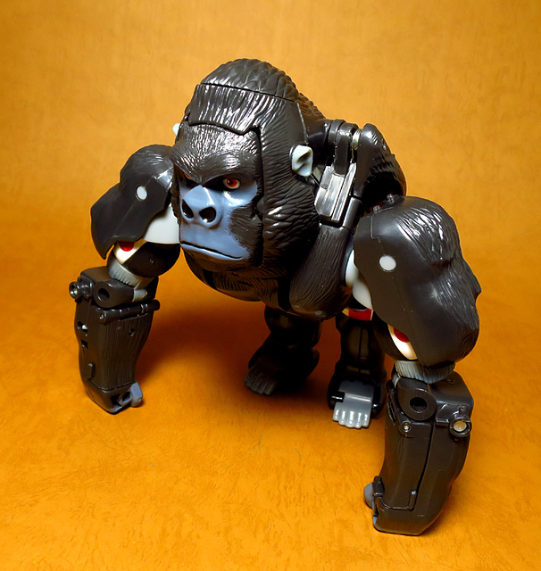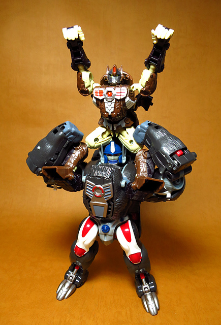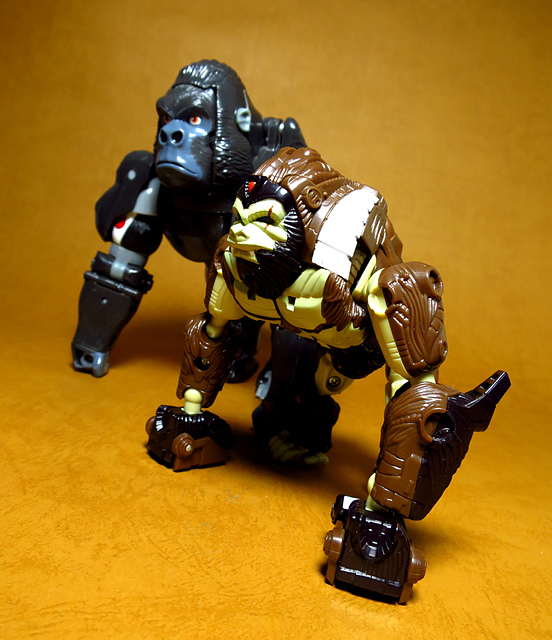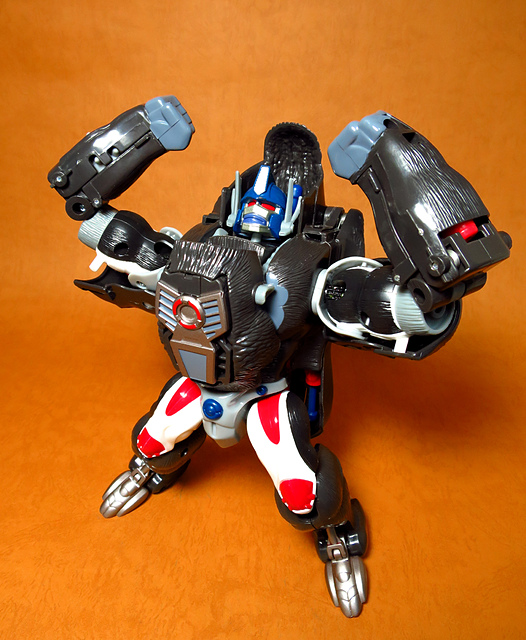 得先承認,我不是一個Beast Wars系列的忠實觀眾,「百變金剛」當年在民視播映之際,我也只是有一搭沒一搭地觀賞,但是,金剛王從黑猩猩的野獸型態變形為機器人的畫面,卻在我的腦海中揮之不去,歷久彌新,莫名地成了兒時回憶中抹滅不去的印痕。這個記憶,一埋就是十來年,直到去年,才有幸在秋葉原入手了這款價格誘人、堪稱是MP上市前最優秀的金剛王。重塗自Beast Wars Reborn的LG02,同樣繼承了這個模組所有的優點,包括了兩種型態的手臂連動機關、超豐富而且在雙型態中均可完全隱藏的武裝、更貼近於動畫形象的兩個頭雕等等,可動來說雖然稱不上是完美頂級,但是和近年的玩具相比,卻一點也不遜色,說實在話,從未接觸過這個模組的我在初次把玩時,真的是驚呼連連,我想一款設計出色的變形金剛,不管過了多久都能讓人回味再三,就是他的醍醐味所在吧?