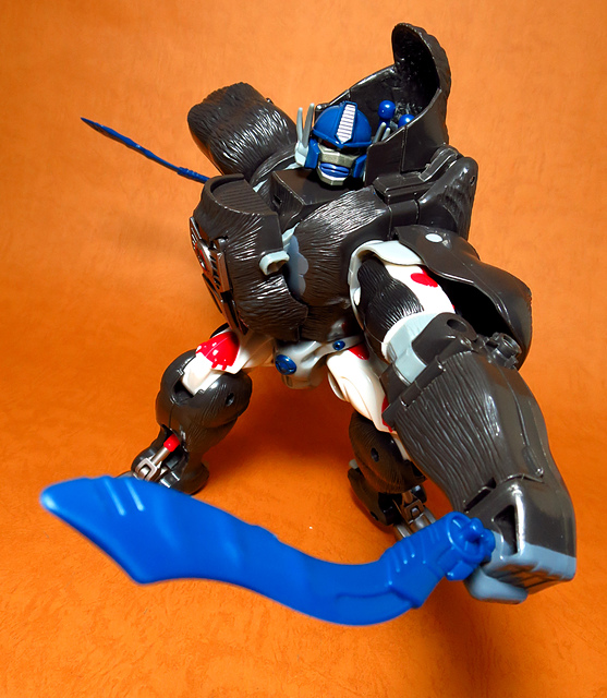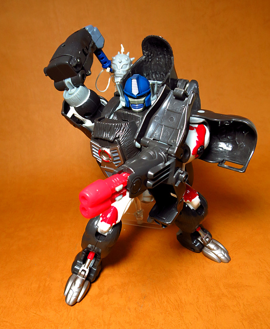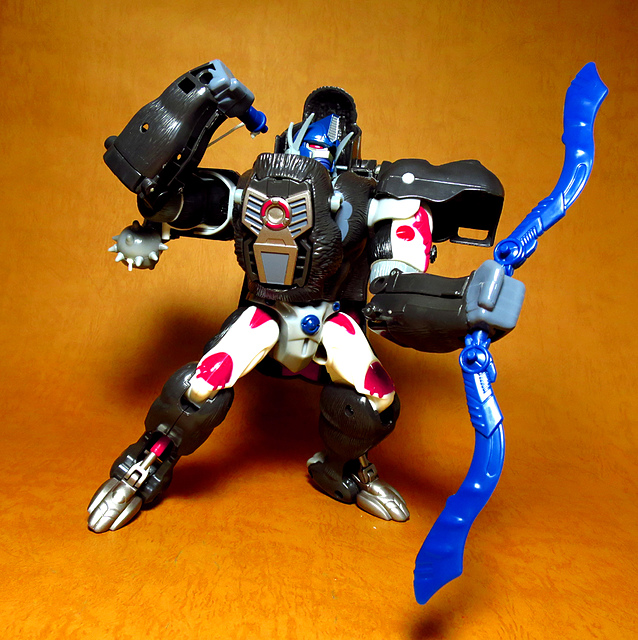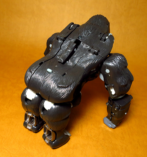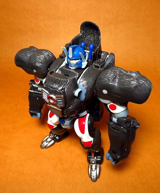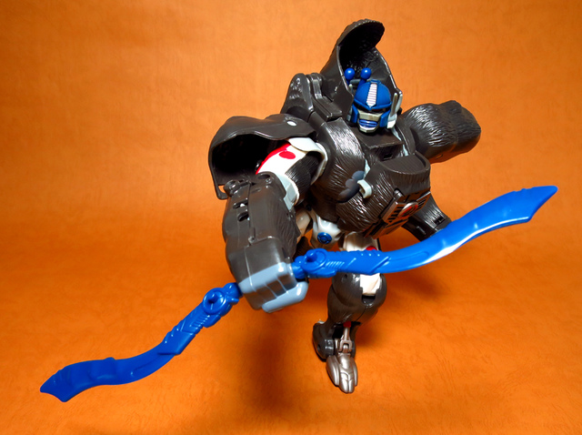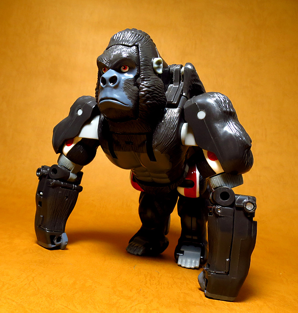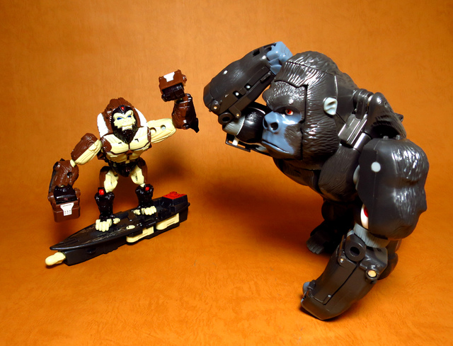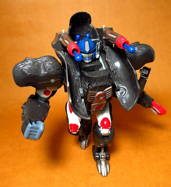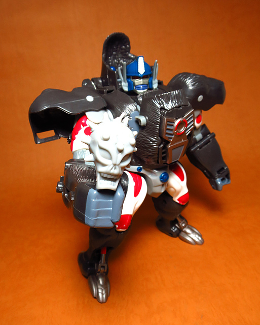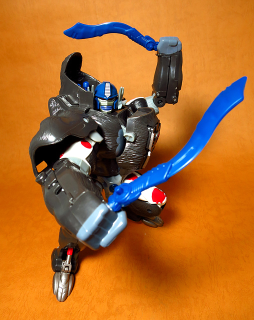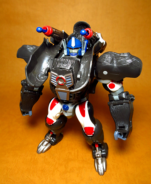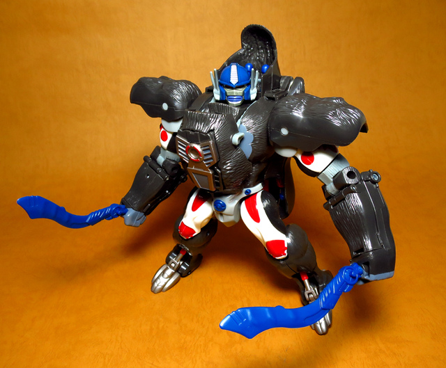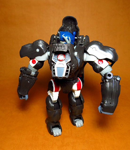 得先承認,我不是一個Beast Wars系列的忠實觀眾,「百變金剛」當年在民視播映之際,我也只是有一搭沒一搭地觀賞,但是,金剛王從黑猩猩的野獸型態變形為機器人的畫面,卻在我的腦海中揮之不去,歷久彌新,莫名地成了兒時回憶中抹滅不去的印痕。這個記憶,一埋就是十來年,直到去年,才有幸在秋葉原入手了這款價格誘人、堪稱是MP上市前最優秀的金剛王。重塗自Beast Wars Reborn的LG02,同樣繼承了這個模組所有的優點,包括了兩種型態的手臂連動機關、超豐富而且在雙型態中均可完全隱藏的武裝、更貼近於動畫形象的兩個頭雕等等,可動來說雖然稱不上是完美頂級,但是和近年的玩具相比,卻一點也不遜色,說實在話,從未接觸過這個模組的我在初次把玩時,真的是驚呼連連,我想一款設計出色的變形金剛,不管過了多久都能讓人回味再三,就是他的醍醐味所在吧?