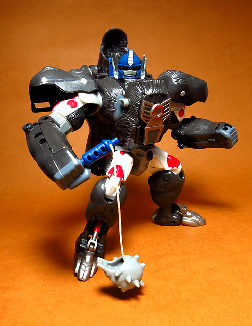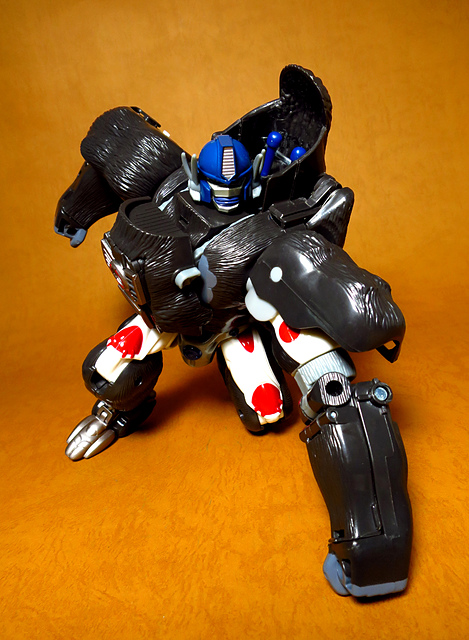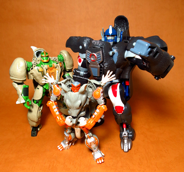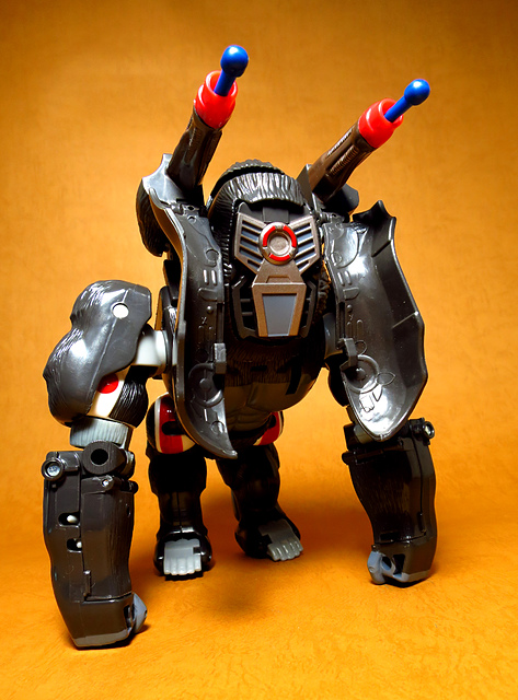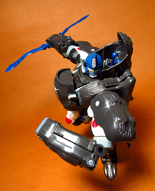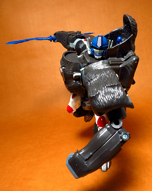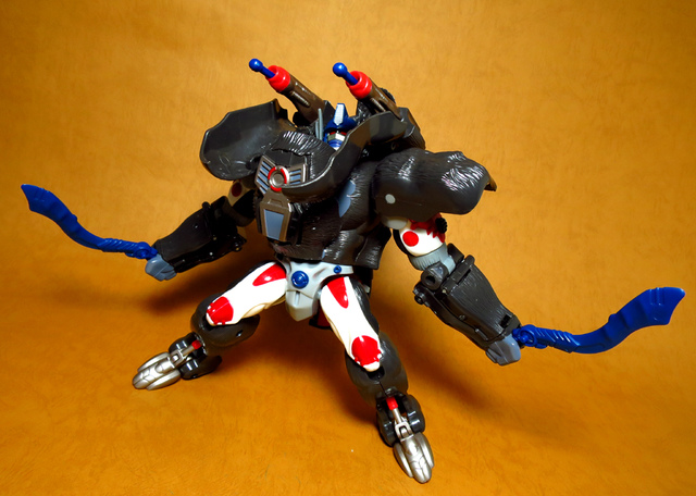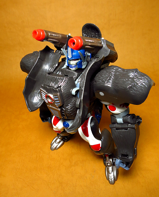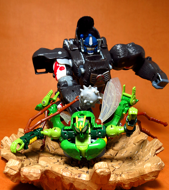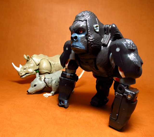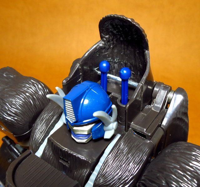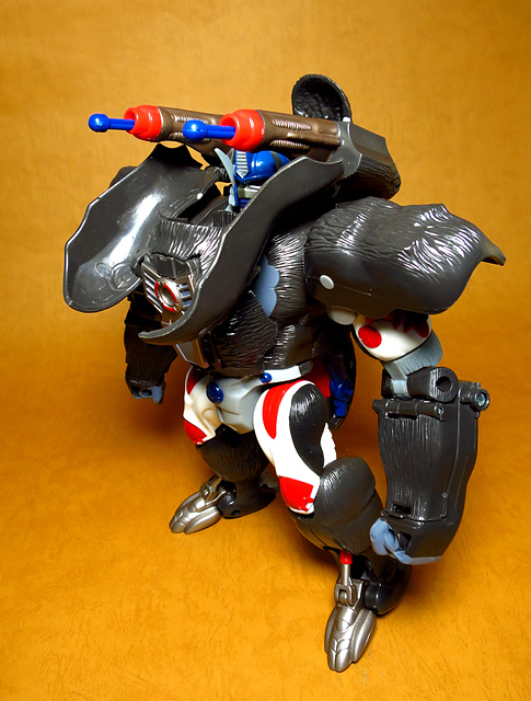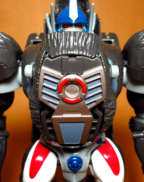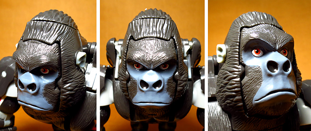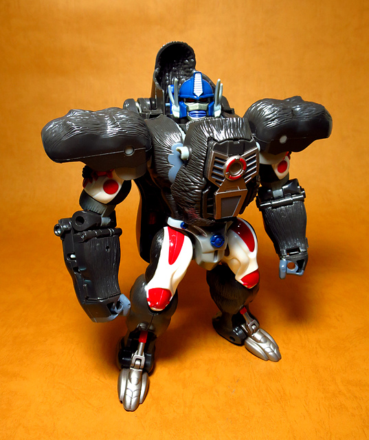 得先承認,我不是一個Beast Wars系列的忠實觀眾,「百變金剛」當年在民視播映之際,我也只是有一搭沒一搭地觀賞,但是,金剛王從黑猩猩的野獸型態變形為機器人的畫面,卻在我的腦海中揮之不去,歷久彌新,莫名地成了兒時回憶中抹滅不去的印痕。這個記憶,一埋就是十來年,直到去年,才有幸在秋葉原入手了這款價格誘人、堪稱是MP上市前最優秀的金剛王。重塗自Beast Wars Reborn的LG02,同樣繼承了這個模組所有的優點,包括了兩種型態的手臂連動機關、超豐富而且在雙型態中均可完全隱藏的武裝、更貼近於動畫形象的兩個頭雕等等,可動來說雖然稱不上是完美頂級,但是和近年的玩具相比,卻一點也不遜色,說實在話,從未接觸過這個模組的我在初次把玩時,真的是驚呼連連,我想一款設計出色的變形金剛,不管過了多久都能讓人回味再三,就是他的醍醐味所在吧?