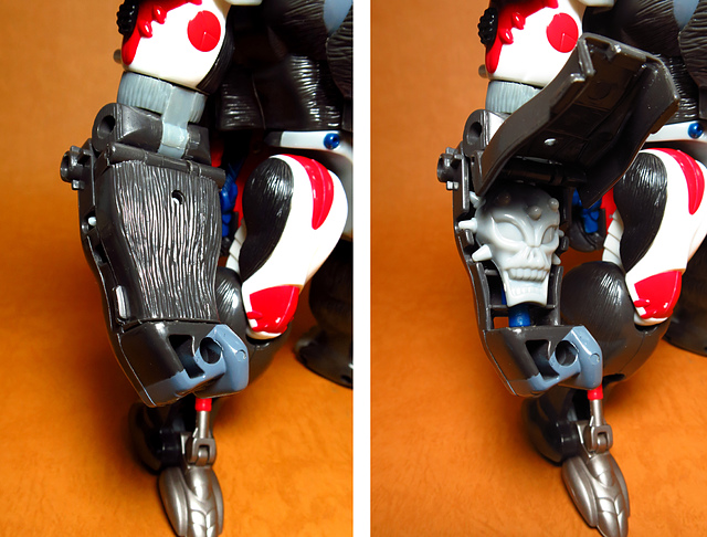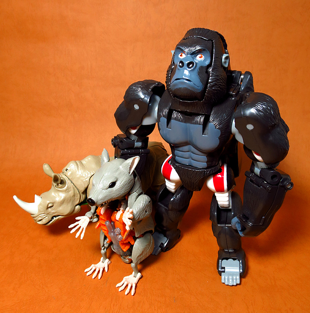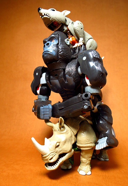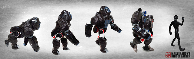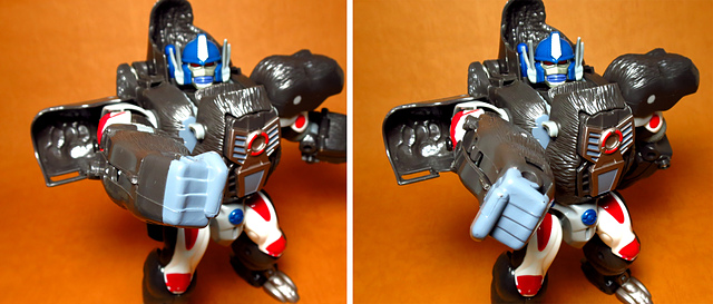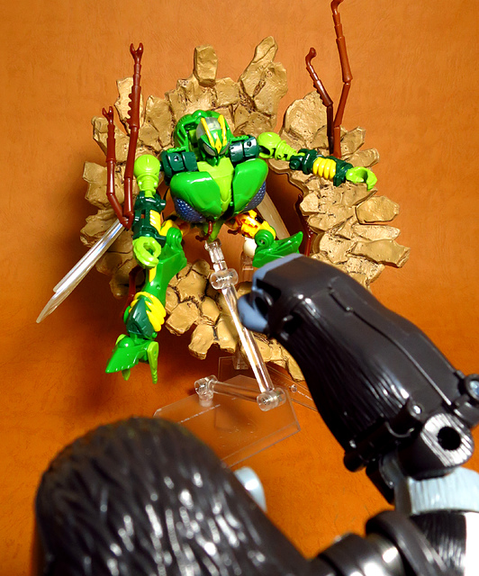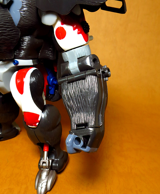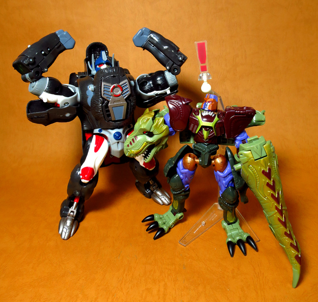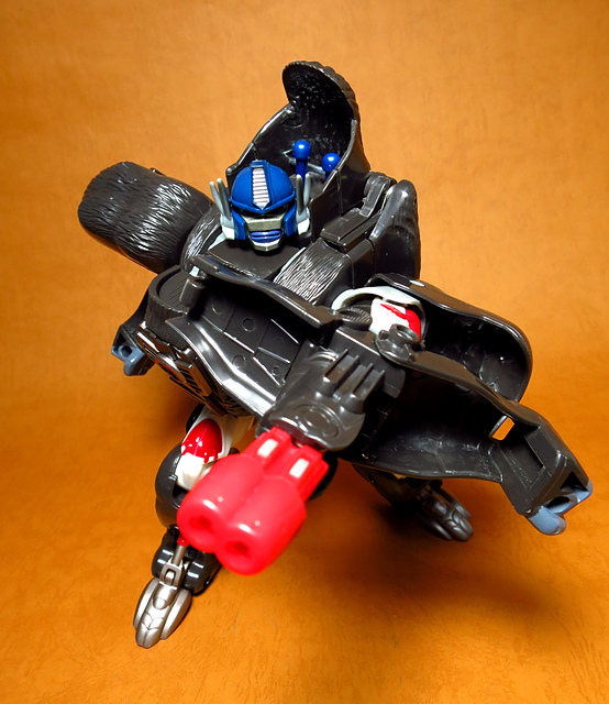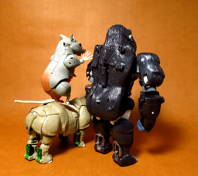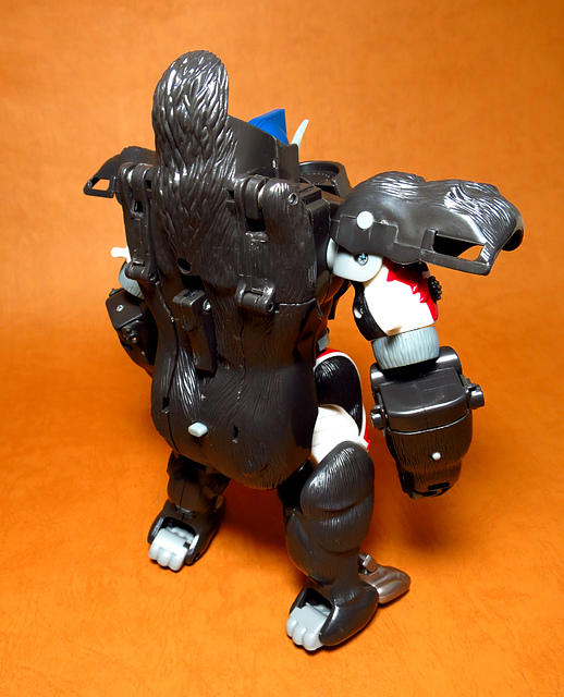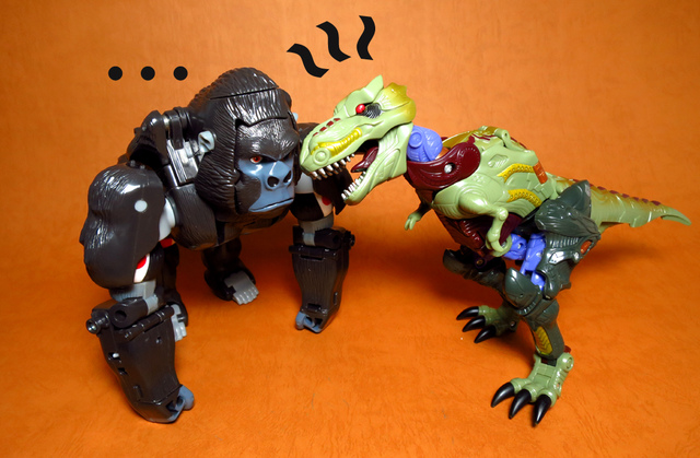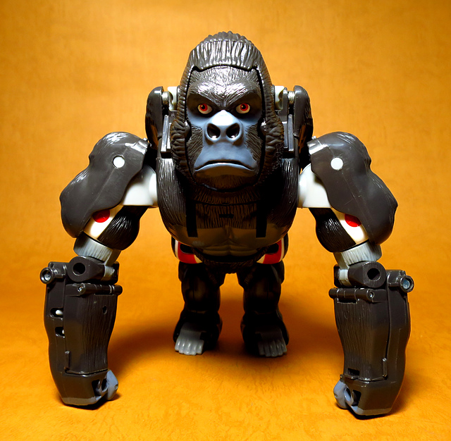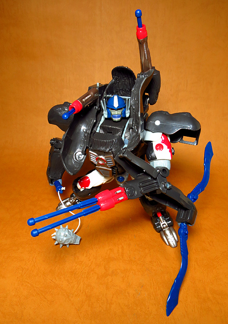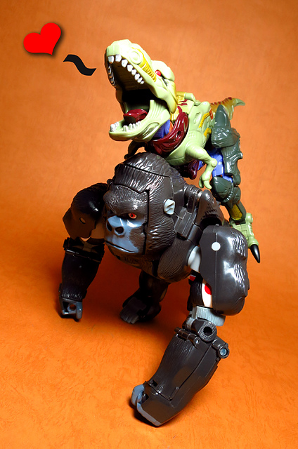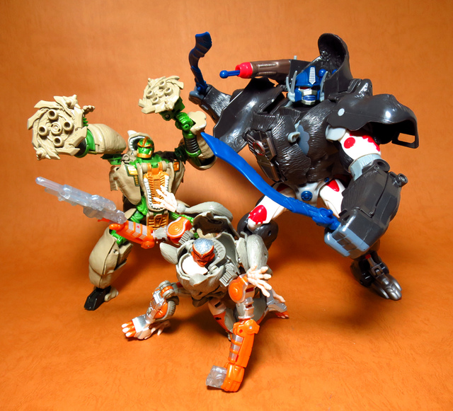得先承認,我不是一個Beast Wars系列的忠實觀眾,「百變金剛」當年在民視播映之際,我也只是有一搭沒一搭地觀賞,但是,金剛王從黑猩猩的野獸型態變形為機器人的畫面,卻在我的腦海中揮之不去,歷久彌新,莫名地成了兒時回憶中抹滅不去的印痕。這個記憶,一埋就是十來年,直到去年,才有幸在秋葉原入手了這款價格誘人、堪稱是MP上市前最優秀的金剛王。重塗自Beast Wars Reborn的LG02,同樣繼承了這個模組所有的優點,包括了兩種型態的手臂連動機關、超豐富而且在雙型態中均可完全隱藏的武裝、更貼近於動畫形象的兩個頭雕等等,可動來說雖然稱不上是完美頂級,但是和近年的玩具相比,卻一點也不遜色,說實在話,從未接觸過這個模組的我在初次把玩時,真的是驚呼連連,我想一款設計出色的變形金剛,不管過了多久都能讓人回味再三,就是他的醍醐味所在吧?