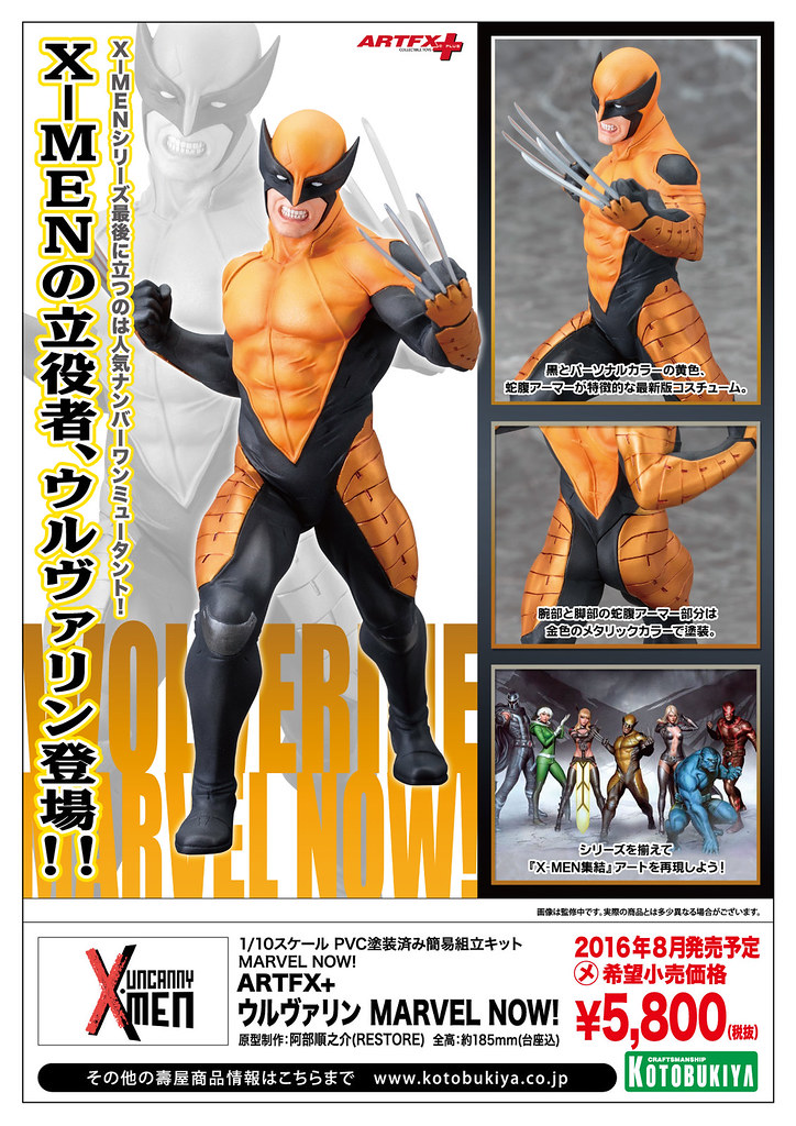 日本知名雕像品牌壽屋公司繼日前在旗下ARTFX+ Statue 雕像系列推出了「萬磁王」(Magneto)、「野獸」(Beast)的雕像作品之後,又將要推出最新1/10 比例全新MARVEL NOW! 版本的「金鋼狼」(Wolverine)角色雕像作品。這次將要推出的造型是來自於漫畫「Uncanny X-Men」中,這個團隊是以X-Men 的元祖成員為主,包括了「萬磁王」(Magneto)、獨眼龍(Cyclops)、白皇后(White Queen;Emma Frost)以及魔術女(Magik)等人。