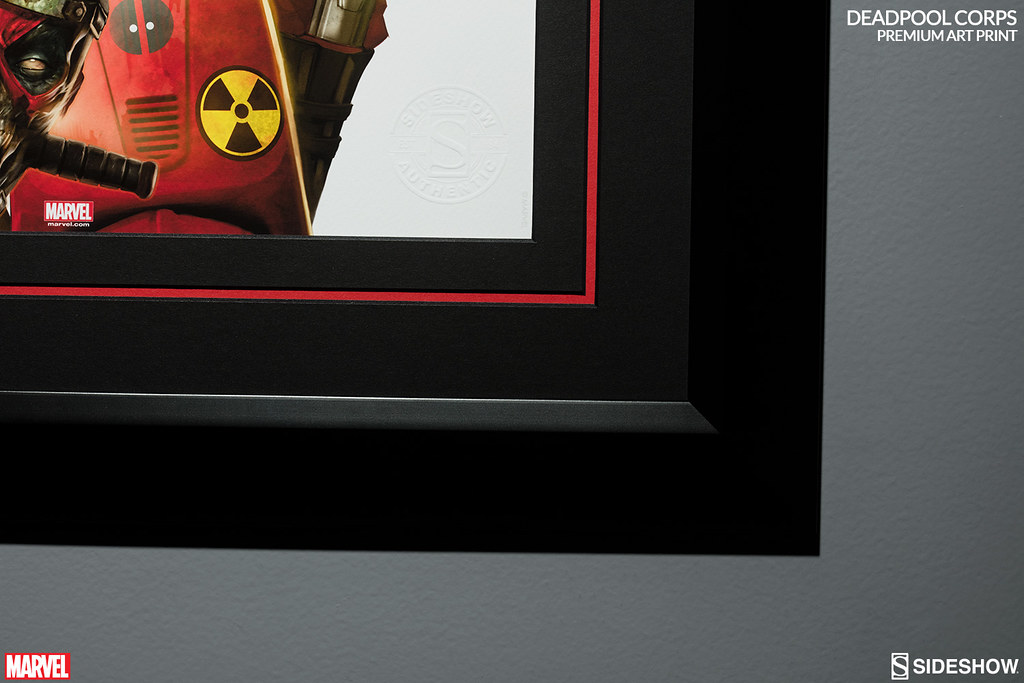 這次Sideshow Collectibles 公司所要推出的「死侍軍團」高級收藏海報作品全球限定300 張,每一張都有藝術家Dave Wilkins 的親筆簽名以及Sideshow 官方的鋼印。值得一提的是,這次販售的版本有分為裱框版與無裱框版;而在裱框版本的部分是採用黑色木頭搭配紅色線條的造型來呈現,超級死侍風格啊!