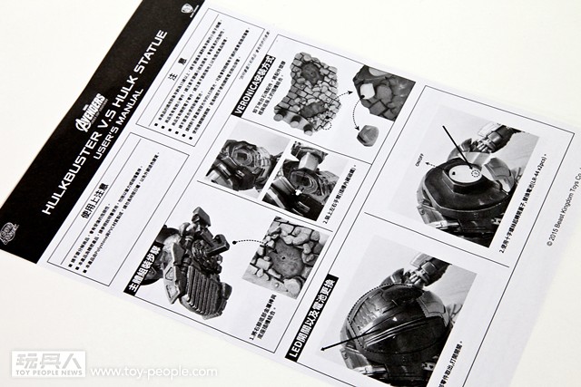 ▼ 「浩克破壞者」盒組的部分是含括了浩克破壞者雕像以及仿地磚質感的地台,而在浩克破壞者雕像的部分,是採用組裝的方式來呈現,因此左、右手臂式可拆卸的。而頭部盔甲的部分因為內建置LED 發光裝置,所以是採用磁石吸附的方式來組裝頭部的配件。