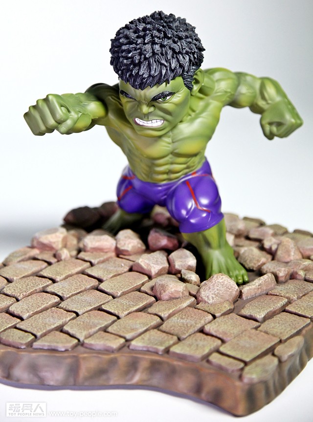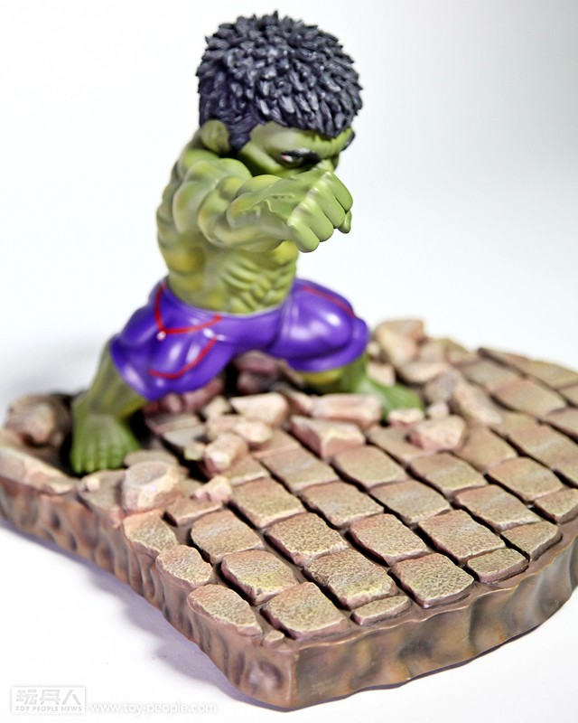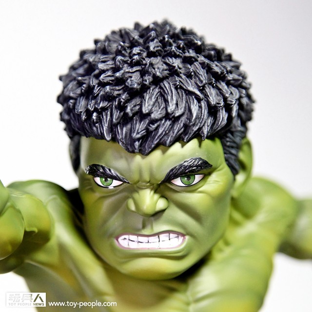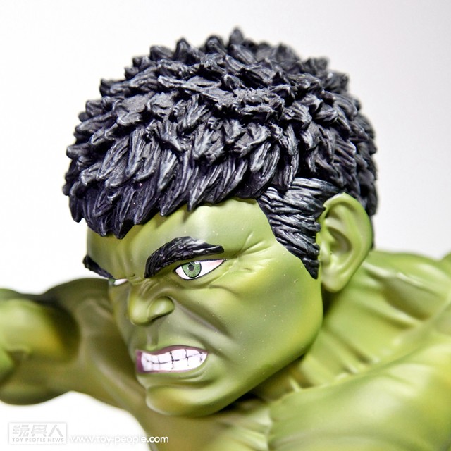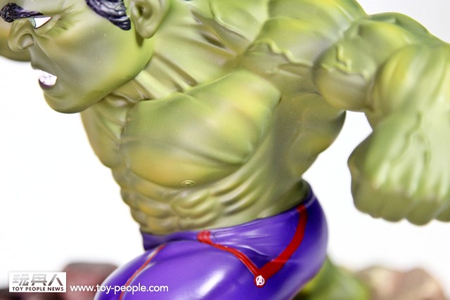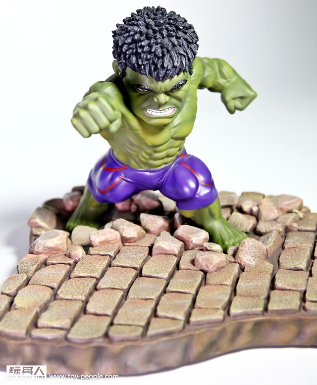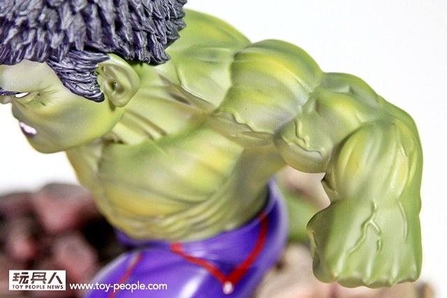 ▼ 「浩克」全身逼真的肌肉線條刻畫,搭配專業上色技法的塗裝效果,整體平光烤漆的方式來呈現浩克綠色暴漲的肌肉質感,讓整體的作品更加的寫實、具有氣勢。此外,細部呈現浩克臉部充滿張力的憤怒表情以及各處戰鬥時肌肉細紋都處理得非常棒。而在地台的部分,是搭配爆裂紋路情境地台以及專屬配件,讓各位玩具人可以感受到能粉碎一切的破壞力。值得一提的是,「浩克」高約8.5 吋,但卻重達3.5 公斤,各位玩具人在把玩的時候絕對可以順便訓練肌肉啊!