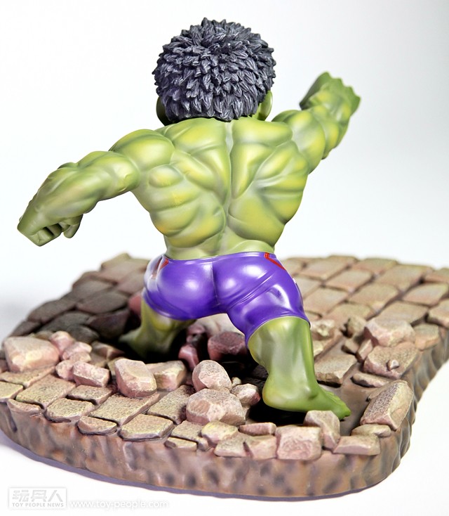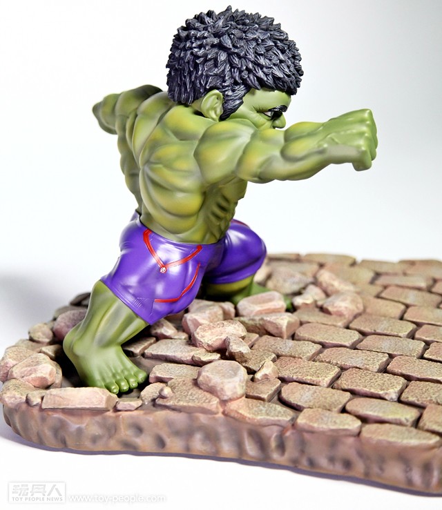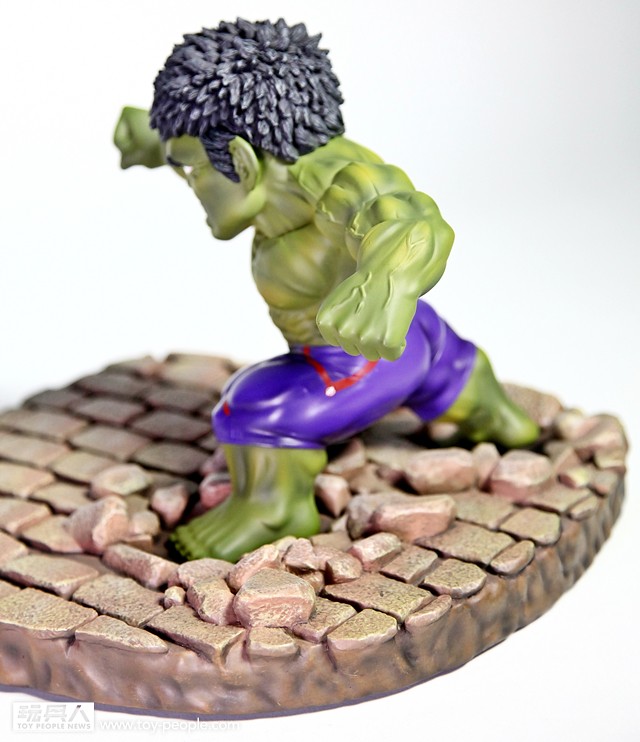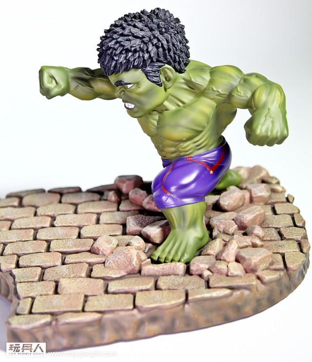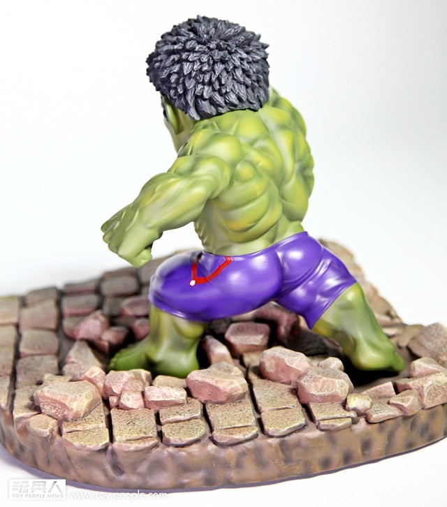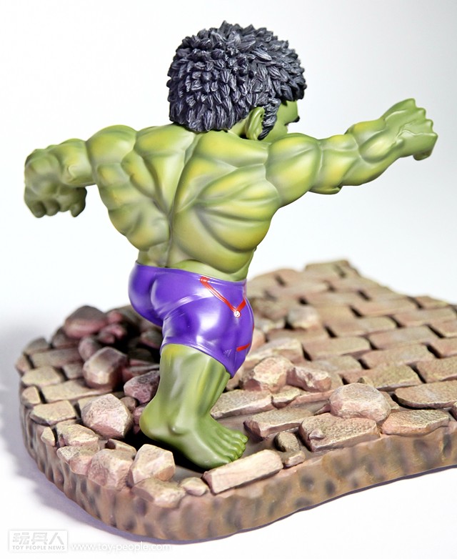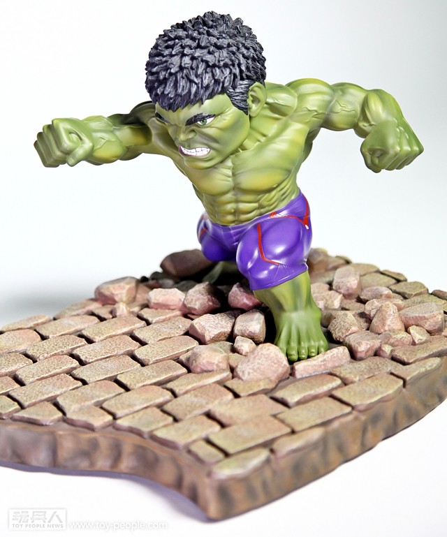 ▼ 「浩克」全身逼真的肌肉線條刻畫,搭配專業上色技法的塗裝效果,整體平光烤漆的方式來呈現浩克綠色暴漲的肌肉質感,讓整體的作品更加的寫實、具有氣勢。此外,細部呈現浩克臉部充滿張力的憤怒表情以及各處戰鬥時肌肉細紋都處理得非常棒。而在地台的部分,是搭配爆裂紋路情境地台以及專屬配件,讓各位玩具人可以感受到能粉碎一切的破壞力。值得一提的是,「浩克」高約8.5 吋,但卻重達3.5 公斤,各位玩具人在把玩的時候絕對可以順便訓練肌肉啊!