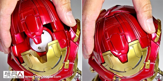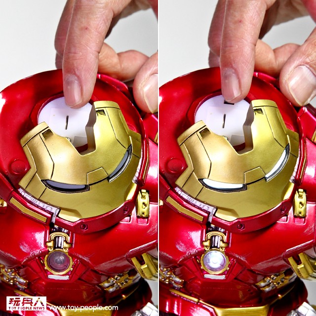 ▼ 「浩克破壞者」內建置的LED 發光裝置的開關設置在頭部的位置,以下為開、關前後的比對圖。
