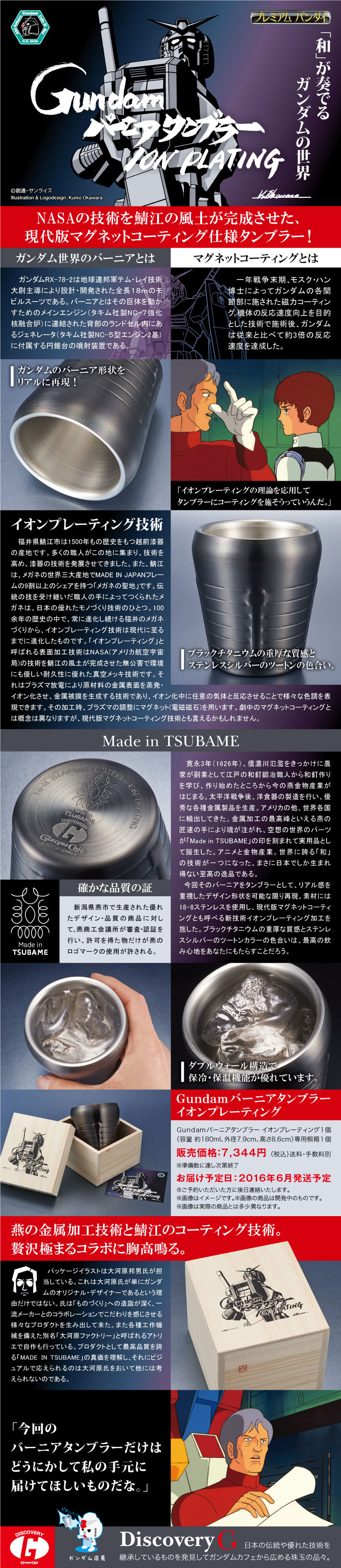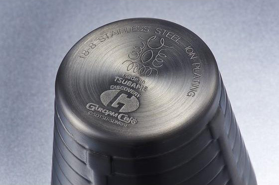 這次所推出的噴射口造型杯(Vernier Tumbler) 離子鍍膜版,同樣是由擁有百年傳統工藝技術的新潟縣燕市擔任製作。這是「GUNDAM Cafe」以「發現G / DISCOVERY G(GUNDAM Cafe)」為主題,與日本各地繼承了優良技術的食品、餐具技術所合作的作品。由擁有世界級高評價的金屬加工技術的日本新潟縣燕市所製作,也許許多玩具人對此相當陌生;其實,前幾代的iPod 隨身聽精美的金屬背板,就是由新潟縣燕市所製作。