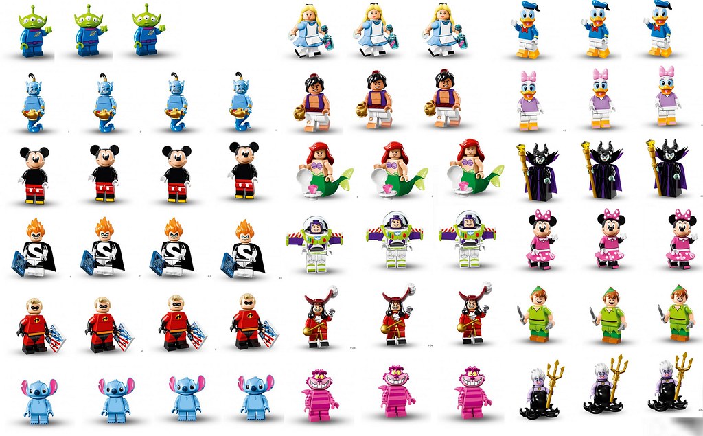 相信各位玩具人對於這次最新編號71012「迷你人偶抽抽包」的配率應該相當期待吧?!而國外已經有相關的訊息公佈了。這次一整箱60 支基本上是能湊出三個整套18 支的迪士尼系列迷你人偶。而在配率的部分:4 支米奇、3 支米妮、3 支唐老鴨、3 支黛絲、3 支小美人魚愛莉兒、3 支烏蘇拉、3 支彼得潘、3 支虎克船長、4 支史迪奇、3 支愛麗絲、3 支妙妙貓、3 支黑魔女、4 支超人特攻隊、4 支辛拉登、3 支阿拉丁、4 支神燈精靈、3 支巴斯光年、4 支三眼怪。