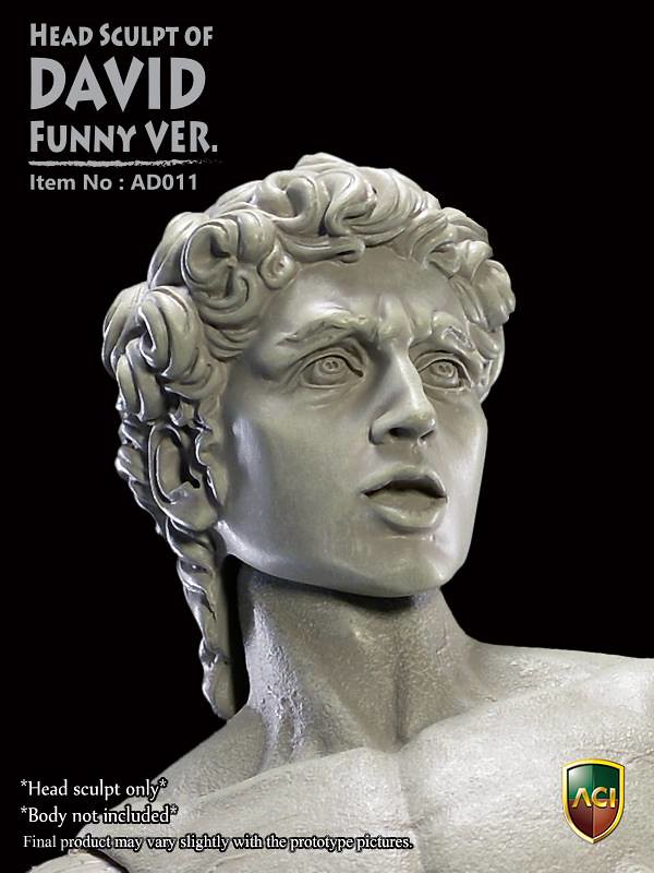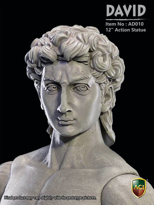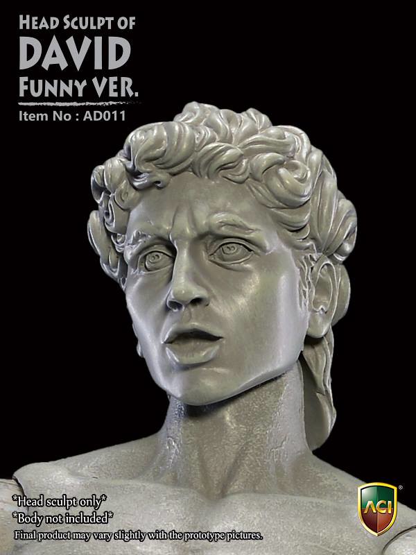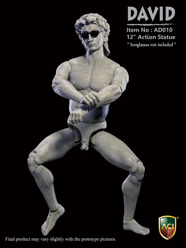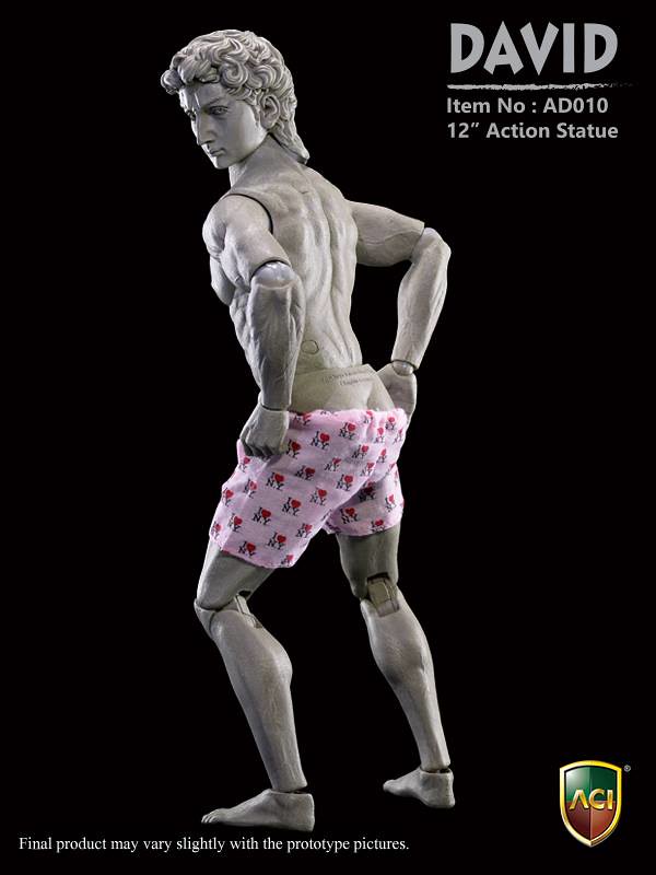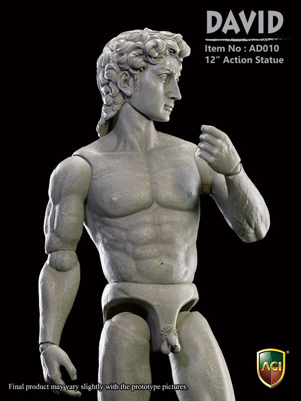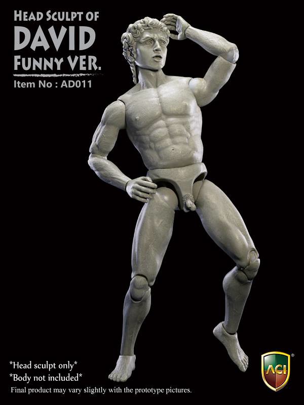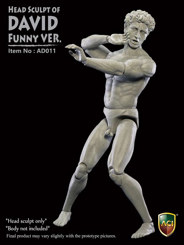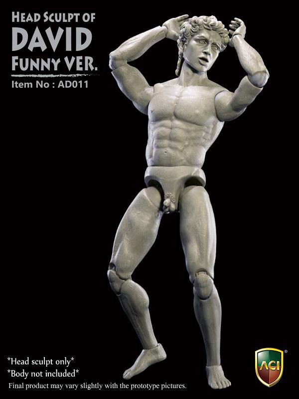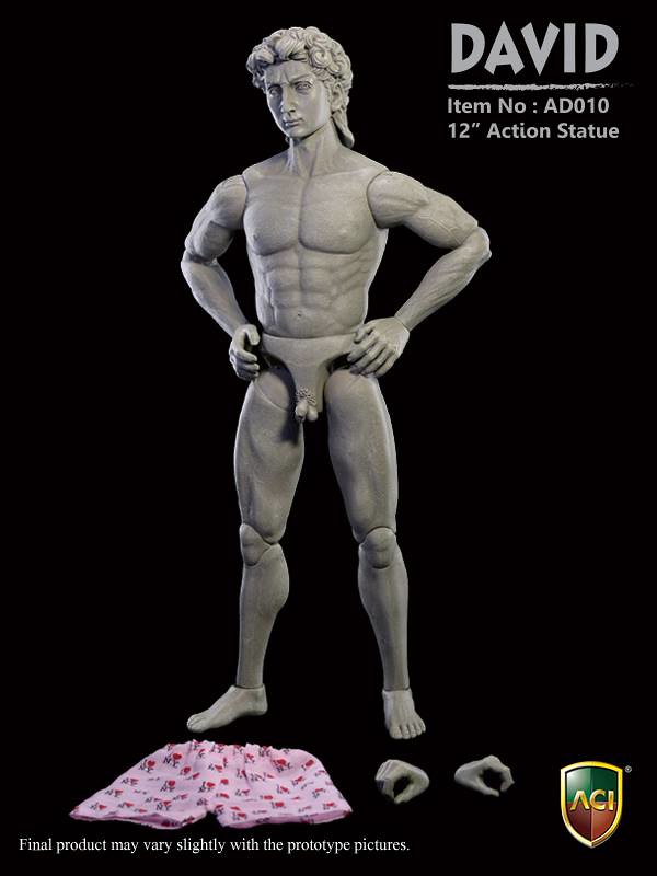 藉由ACI Toys 多年來專注於西洋作品的發展,使用了最新研發的肌肉素體來將「大衛像」12吋可動人偶化,並將除了原始造型之外,還附有一對手部替換零件,以及將其“藝術性”稍稍遮掩、能夠輕鬆大膽展示的粉紅內褲。 另外,此商品將同步推出普通版的大衛像,以及能夠將頭雕改為張嘴搞笑模樣的選購頭雕配件大衛像(搞笑版)。
