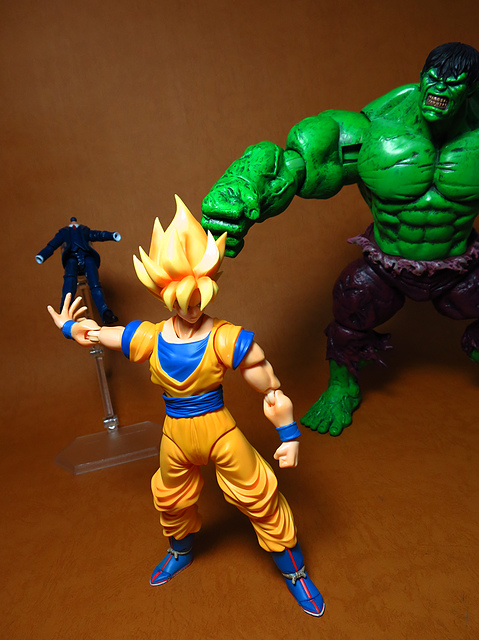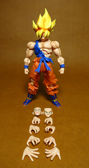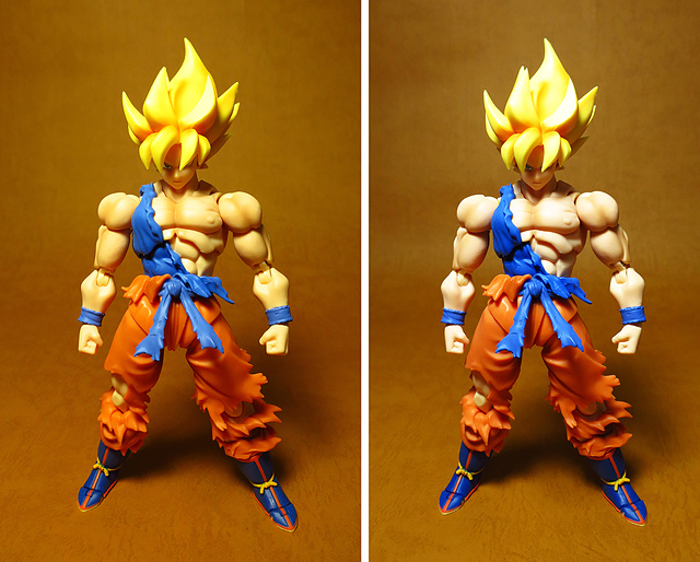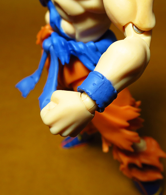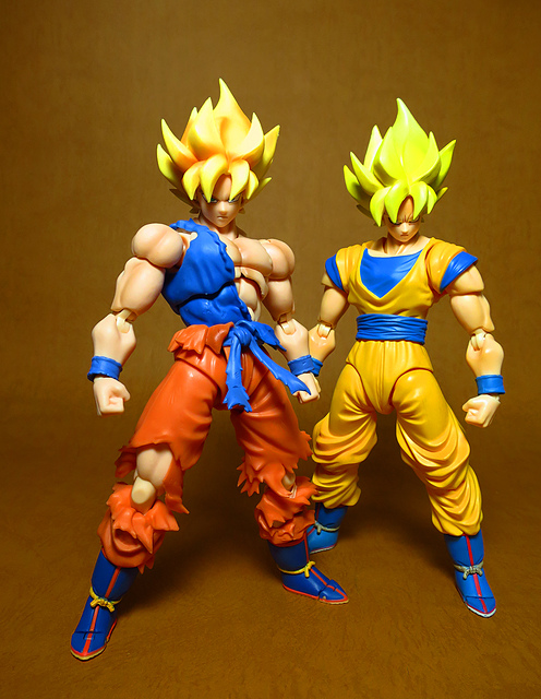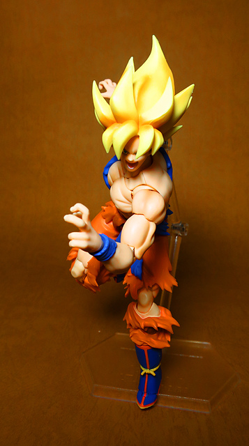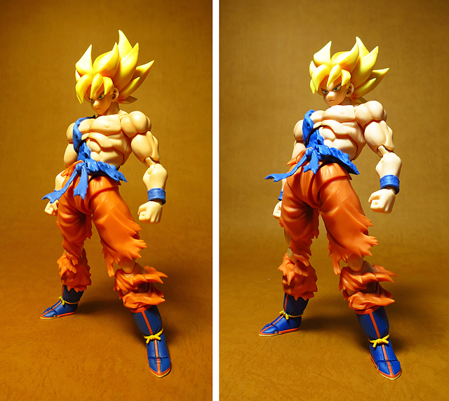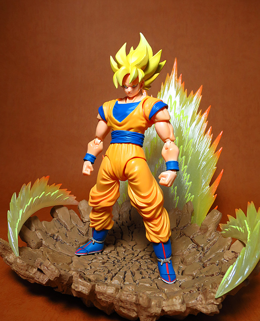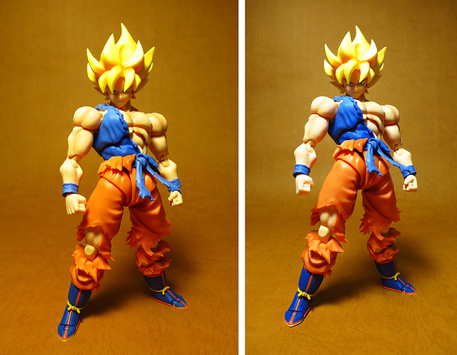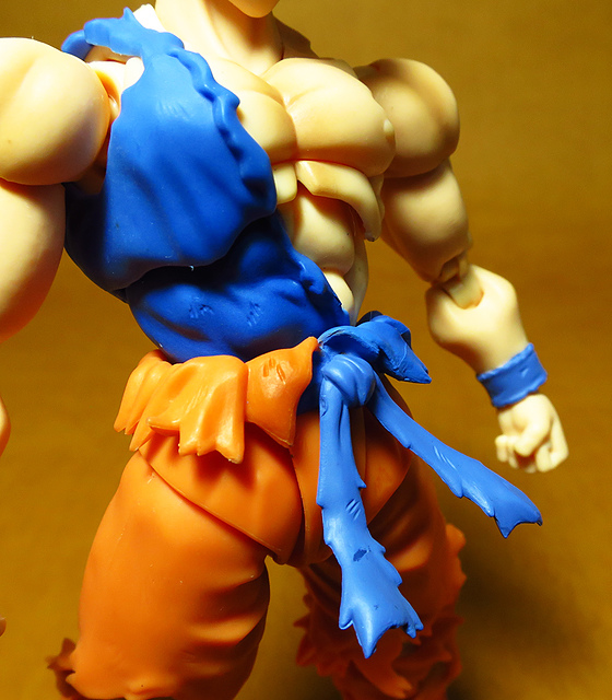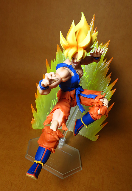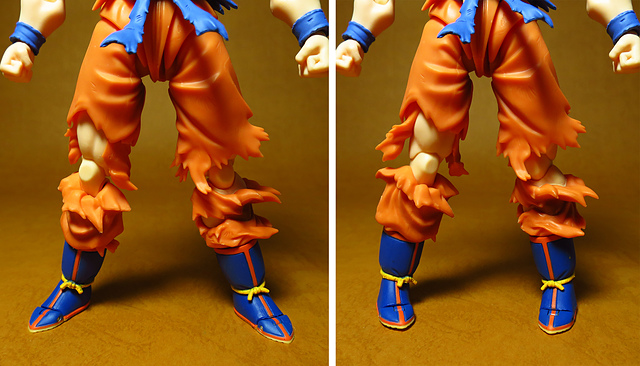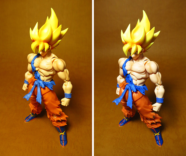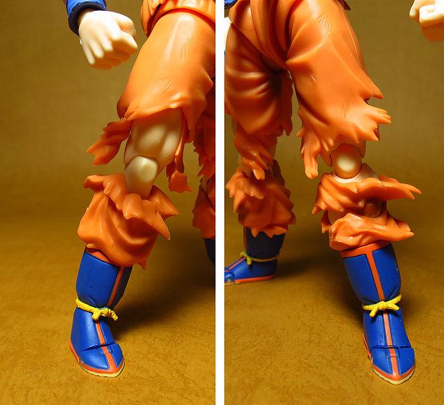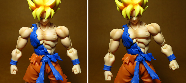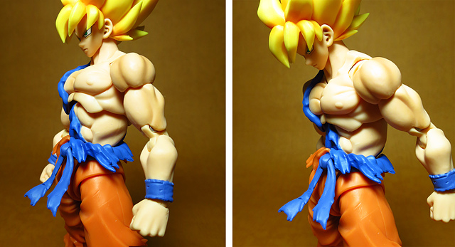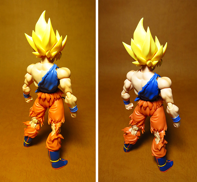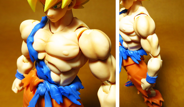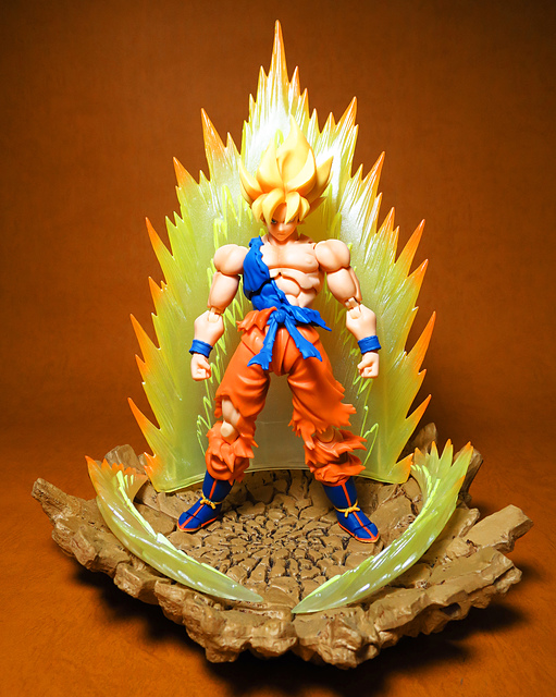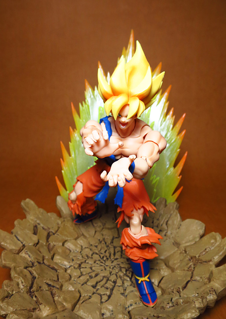 2010年,BANDAI正式將七龍珠的角色納入自家的S.H.Figuarts產品線中,在推出第二彈的超級賽亞人孫悟空(以下簡稱為初版,註2)後,兼用性超高的道服素體便一路延用,而這一用就是五年,即便那詭異的「尿布褲」一直被玩家們詬病,BANDAI卻始終沒有想要打造新模的意思,直到去年,官方終於因應廣大玩家的要求推出了這款新覺醒版,除了全新且更美觀的髖關節,就連上半身和褲管也破格地採用了應該很難兼用的爆衣造型,完全重現了納美克星上與佛力扎激戰後的樣貌,可動性方面也因為造型的關係強化了很多,包括肩部和腰部,都因為少了衣服的妨礙而靈活不少,遠比初版更能展現出豪邁的憤怒超戰士之貌。除了讓人激賞的本體,BANDAI也在同時期推出了彷彿是為了這款悟空量身訂作的魂EFFECT氣場特效,再搭配IMPACT岩石地台,超級賽亞人覺醒的場景便在眼前完美重現,熱愛七龍珠的玩家、一定要全部都給他收藏啊!