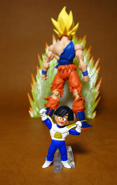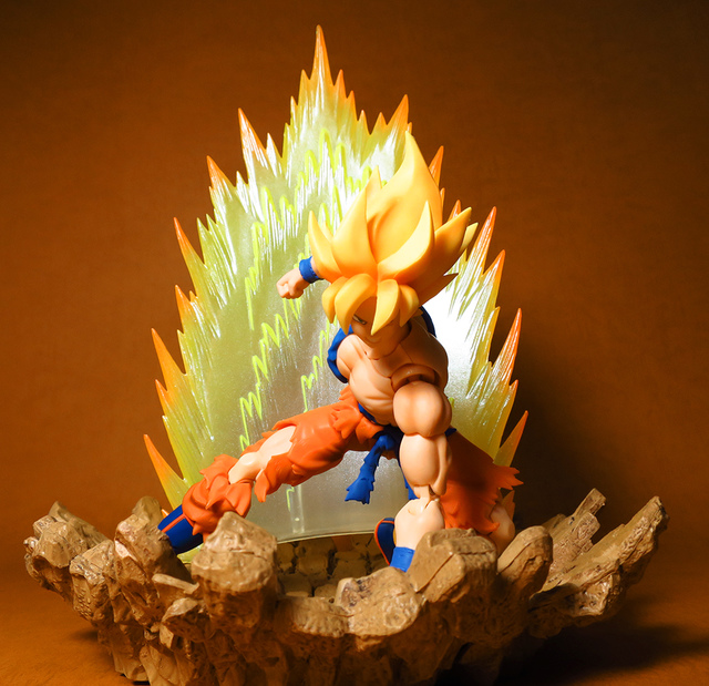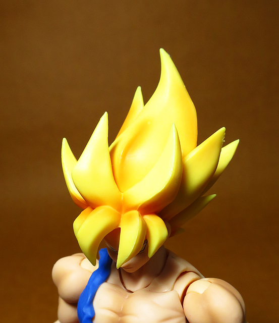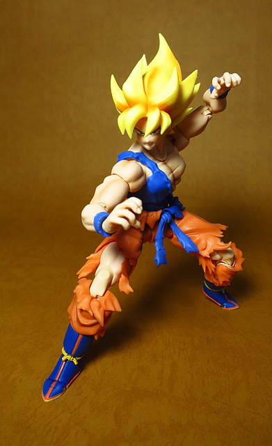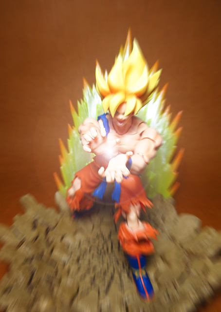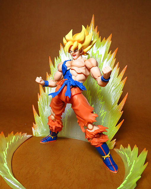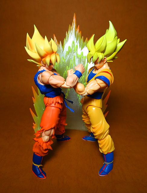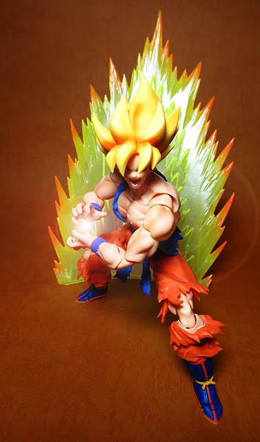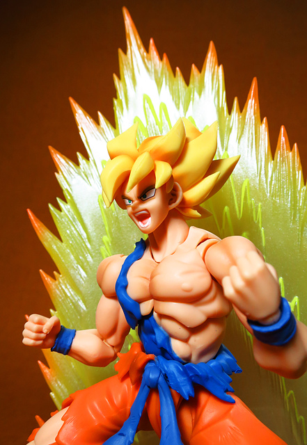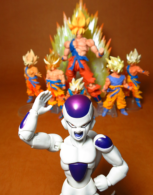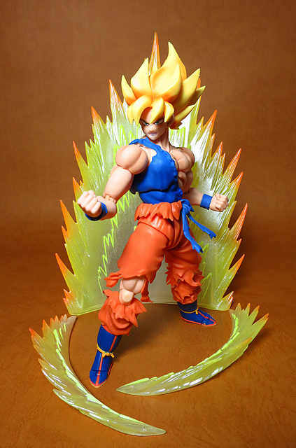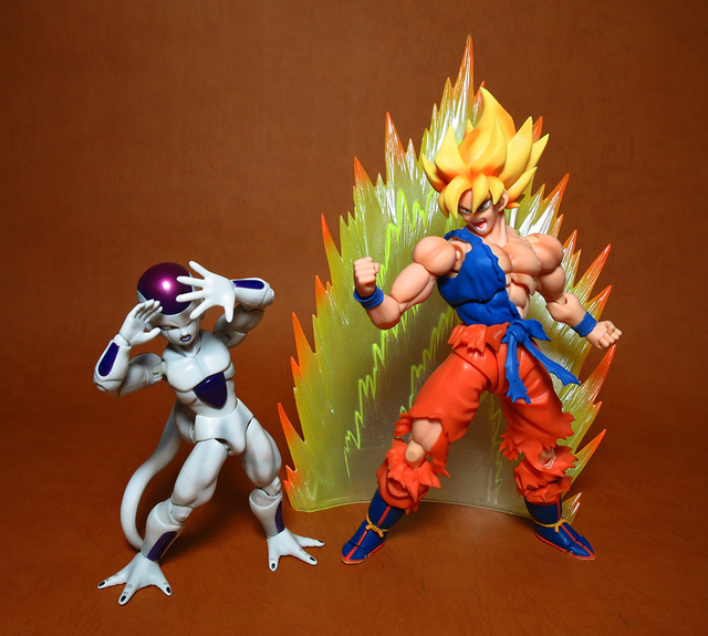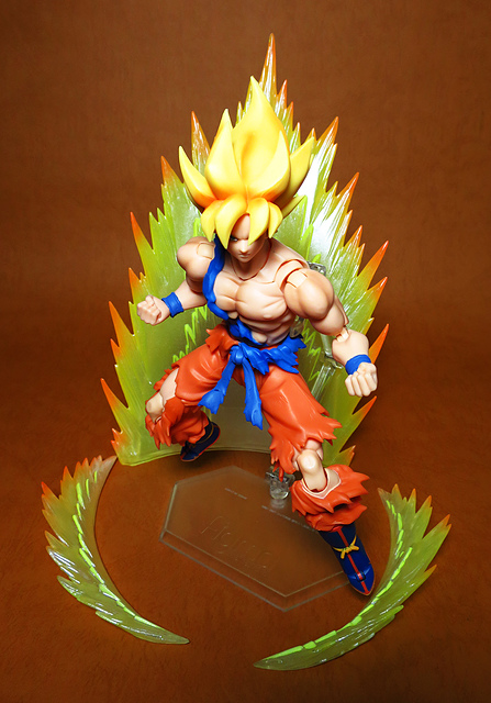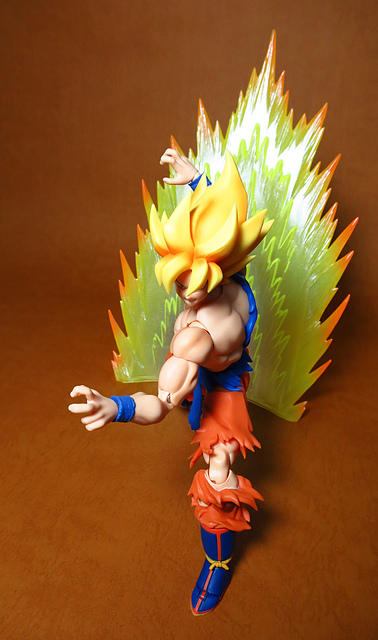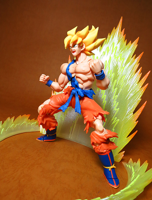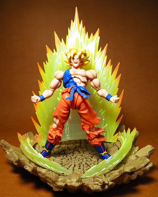 ↓在克林慘遭佛力扎爆體後,悟空的憤怒突破了身體的界限,變身成傳說中的超級賽亞人。順帶一提來個專業考究,其實悟空在這個當下藍色的內衣還沒破開,而是在歷經激鬥之後才又破掉一半成玩具這個樣貌