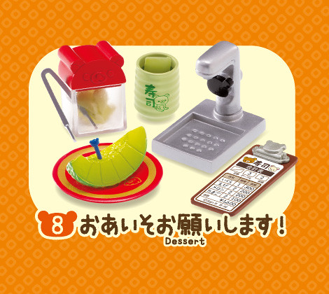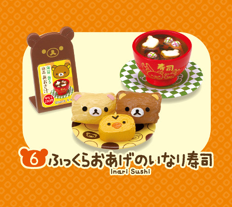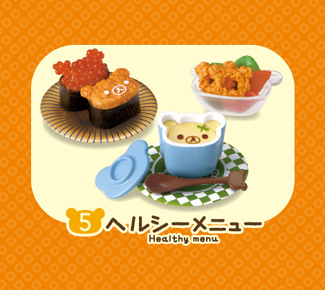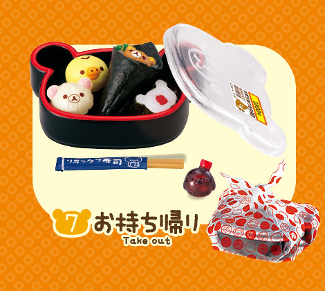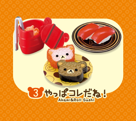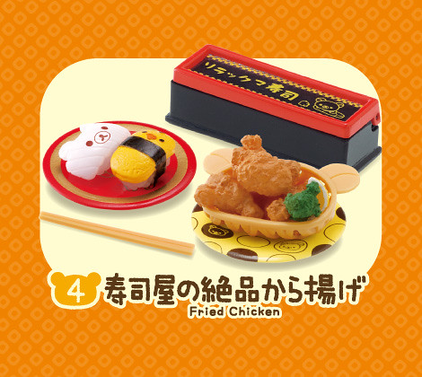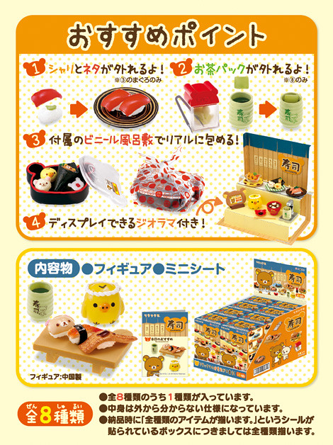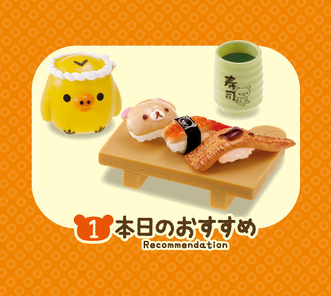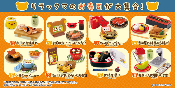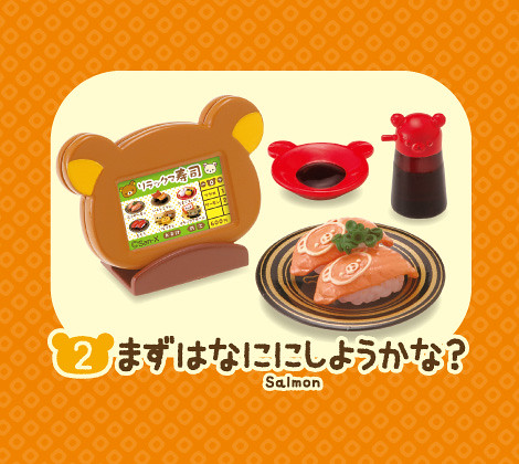 這次「拉拉熊迴轉壽司店」(リラックマ 寿司)系列作品共有八款造型:本日精選(本日のおすすめ)、到底該點什麼呢?(まずはなににしようかな?)、就是這個了!(やっぱコレだね!)、好吃的壽司(寿司屋の絶品からあげ)、健康美食(ヘルシーメニュー)、超豐盛豆皮壽司(ふっくらおあげのいなり寿司)、外帶餐盒(お持ち帰り)、多謝款待(おあいそおねがいします),每個款式都看起來好好吃啊!