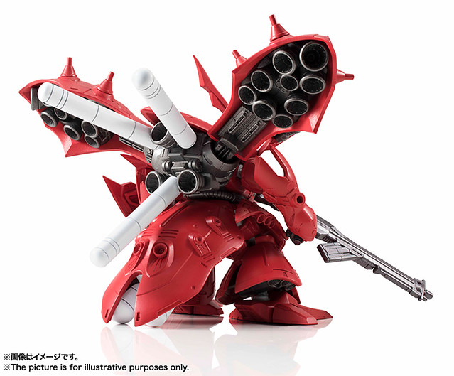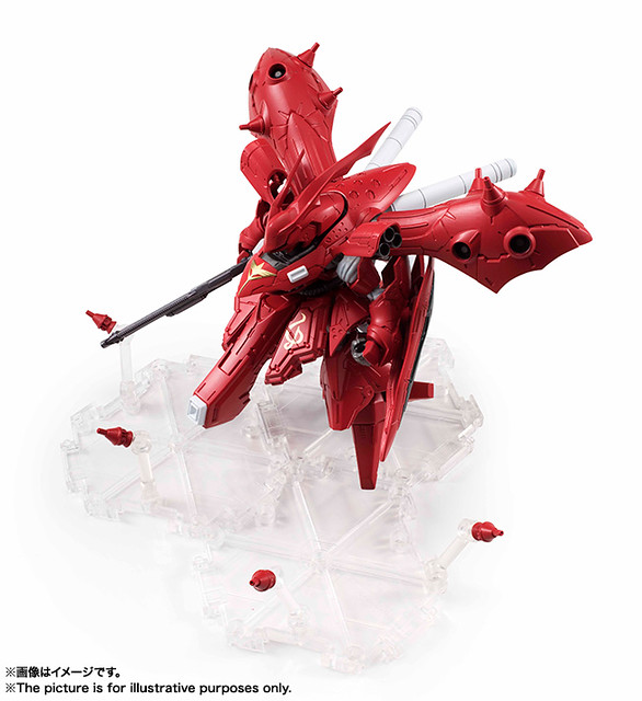機體各部位有著推進噴嘴也都完整再現,作品附有武器光束步槍、光束斧、盾、浮游砲×10、專用的地台和支柱×4等等多款配件,可以呈現與“阿姆羅”宿命對決作戰時候所使用「浮游砲」的狀態,提供給喜歡《機動戰士鋼彈》系列作品的玩具人參考。